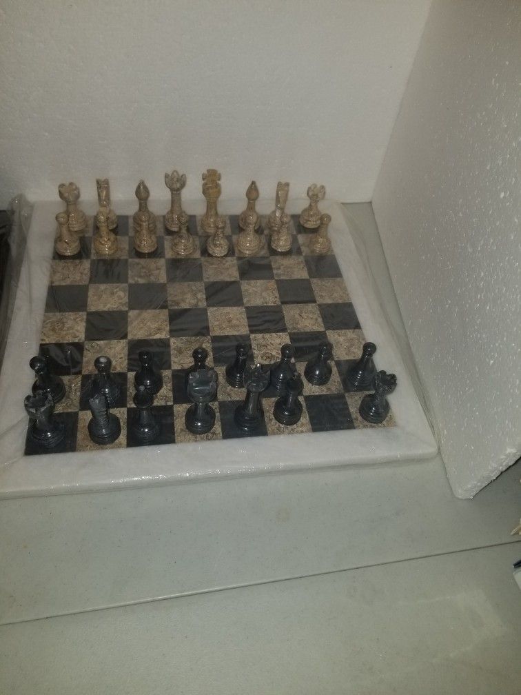 We are selling a Used Coral Chess Set that is in good condition with the exception of a broken knight (which can be easily glued back together) The pieces are 1 3/4 to 3 inches tall. The board is 15 X 15. Both the pieces and the board are heavy and sturdy.