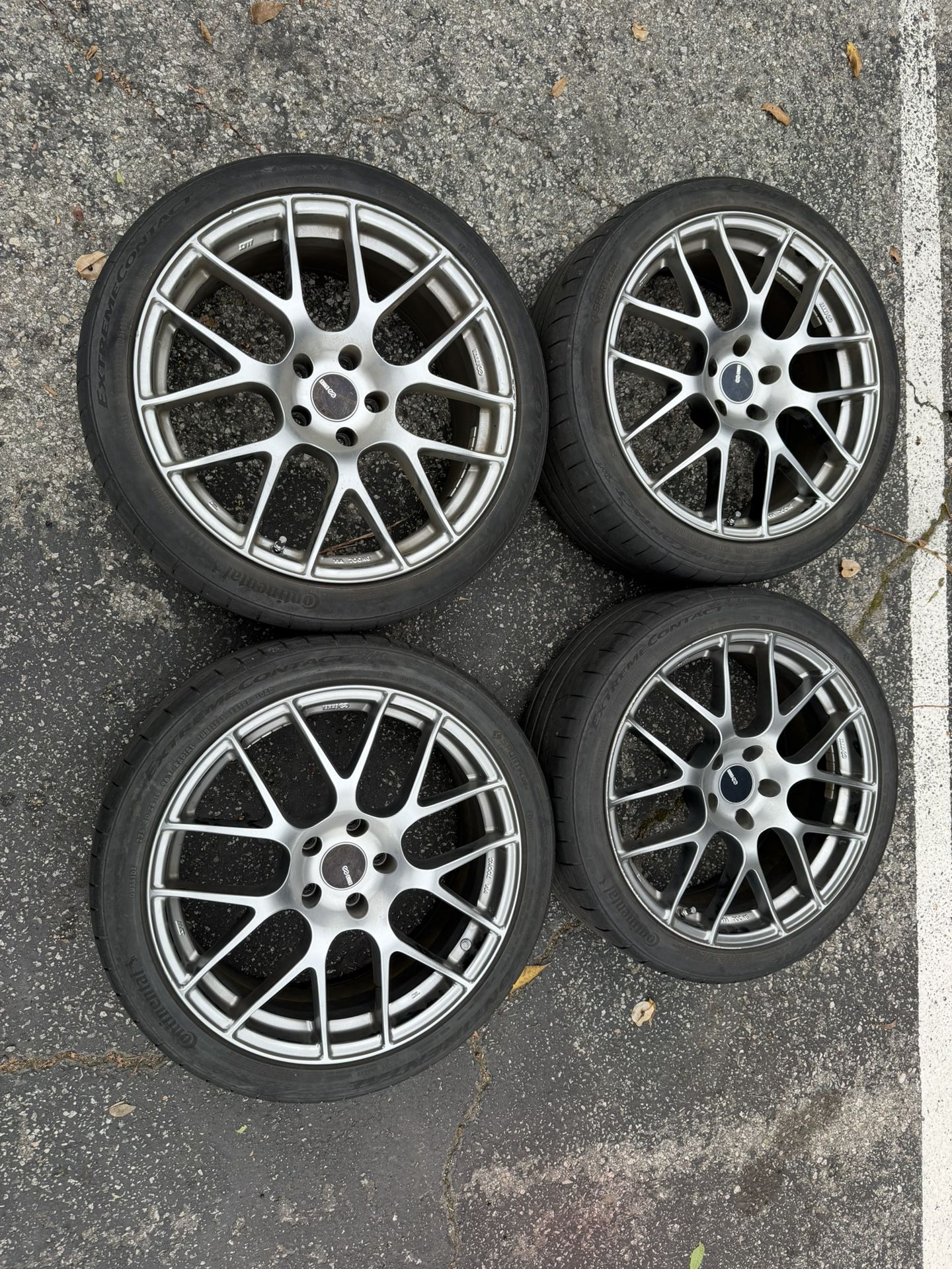 A set of (4) 19x8.5+35 5x114.3 Hyper Silver with 235/40/19 Continental extreme contact sport with brand new Rays Valve Stems 15% tread on 2 40% tread on 2 No cracks / bends / no issues Some rashes on wheels (see photos) Pickup only / Cash only