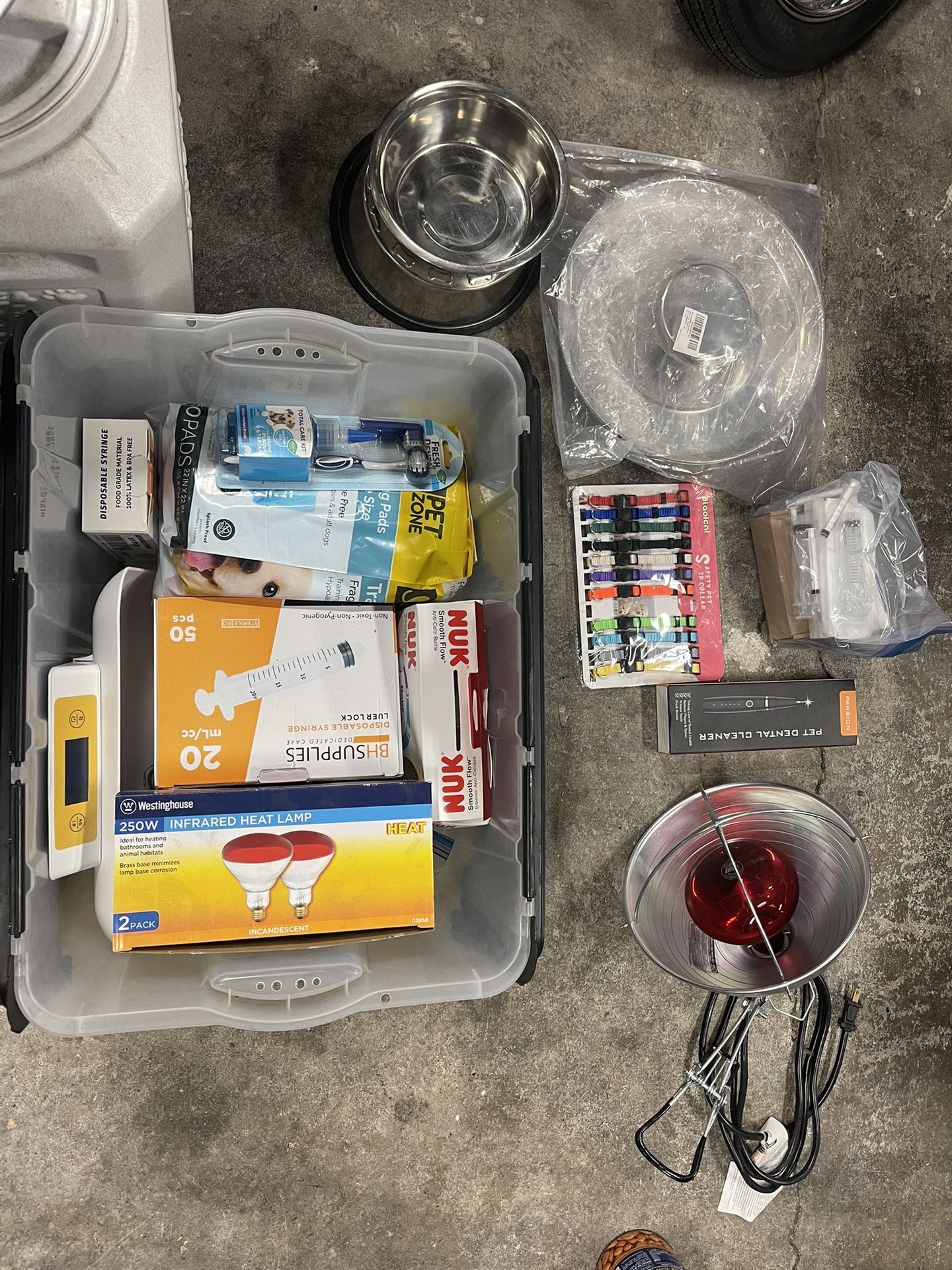 Have a lot of items for puppy litter. Feeding dish, ID collars , feeding syringes, dental cleaner, whelping box heating lamp with extra bulbs, training pads, puppy scale, electric nose and throat clearer, thermometer.