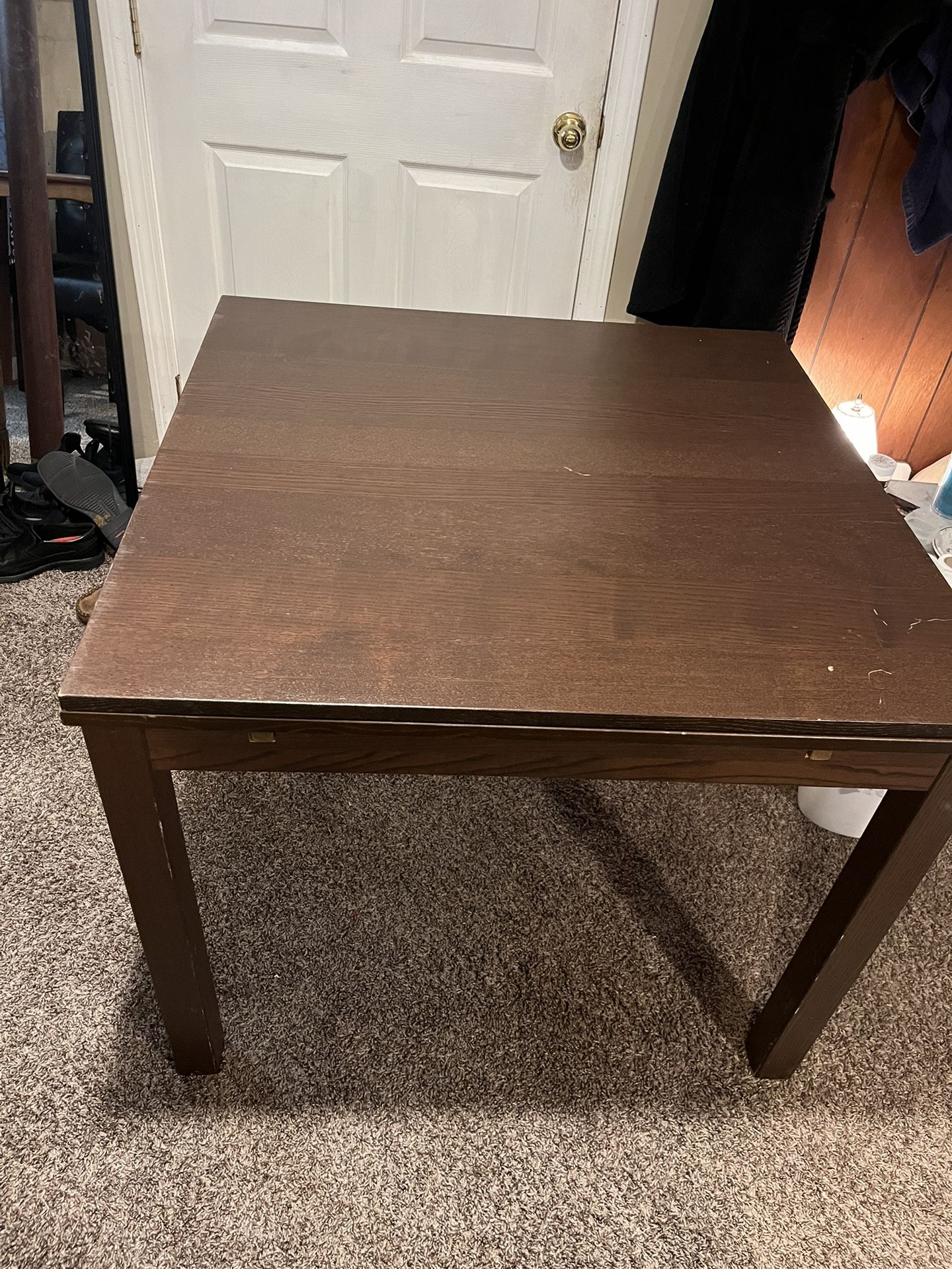 This is a square solid wood table for 4 people, that can easily extend into a bigger table to fit 6 people! Wood looks a little used from use but is a nice sturdy yet comfy table in great condition. :) 35.5”x35.5”