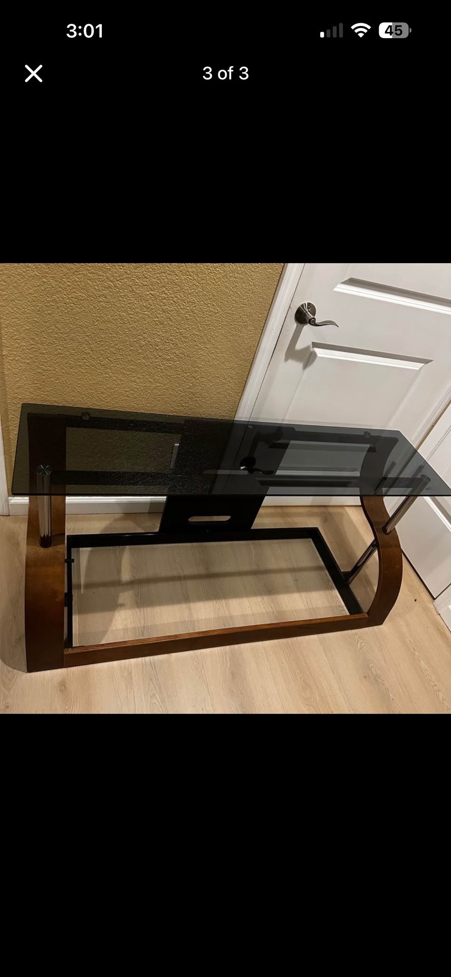 Selling as we no longer need , can fit a 75inch tv , comes with all pieces 3 layer glass shelves Marking down price just want it gone!!