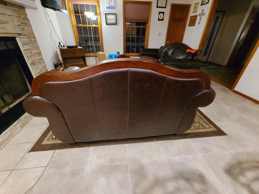 Faux leather couch and loveseat, brown in color. Was main couch until new one was bought. Then it became the kids couch. Still in good condition just a little discolored from use.
