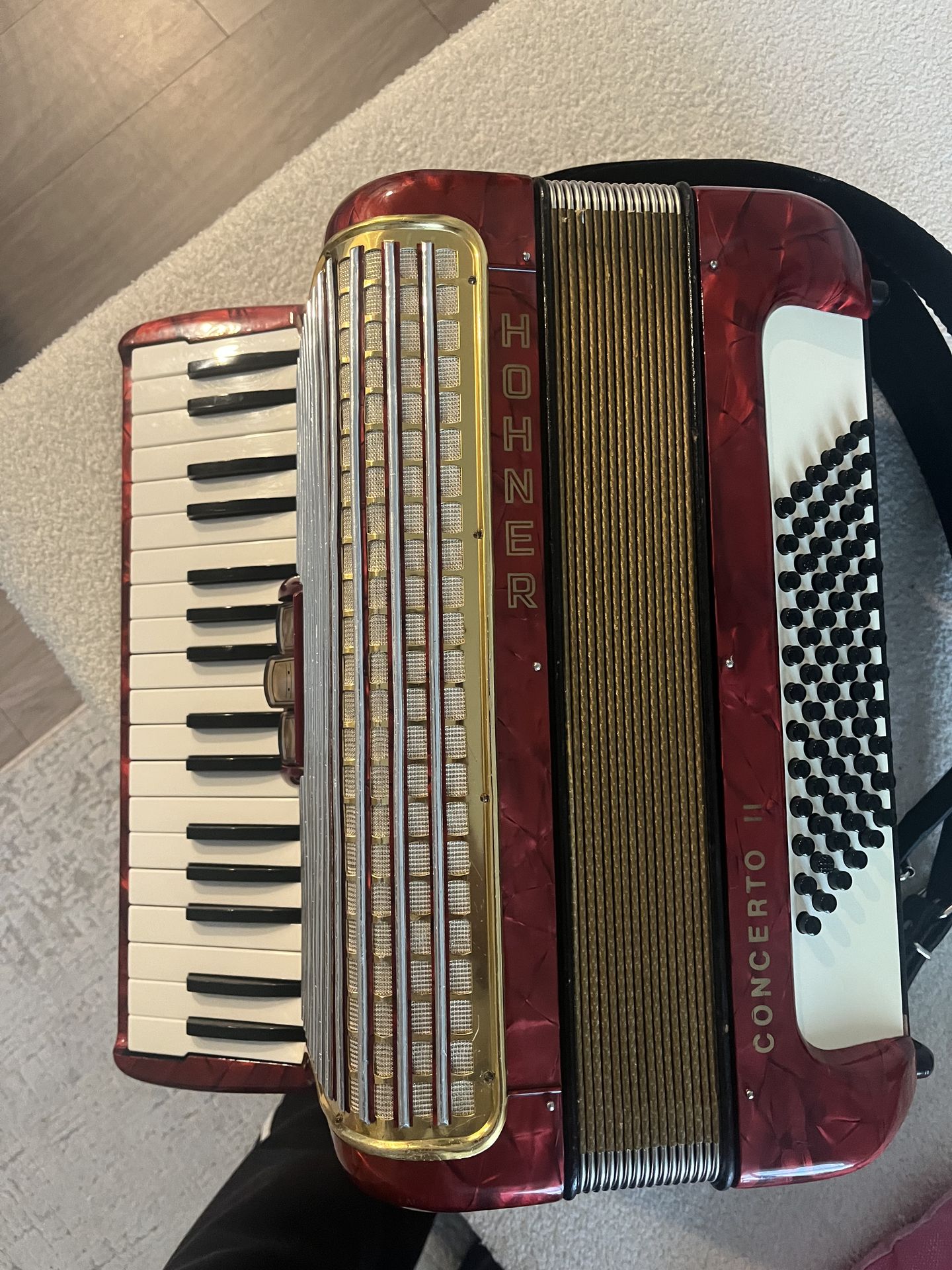 Selling my Hohner Concerto II piano accordion. It plays great and was recently tuned. All keys and bass buttons work and the bellows are in good condition. Comes with the original case. I’m selling it because I prefer button accordions and want to upgrade my button accordion. Message me if interested. Vendo mi Hohner Concerto II acordeón de teclas. Suena muy bien y está recién afinado. Todas las teclas y bajos funcionan y el fuelle está en buenas condiciones. Viene con su estuche original. Lo vendo porque prefiero acordeones de botones y quiero mejorar mi acordeón de botones. Mándame mensaje si te interesa.