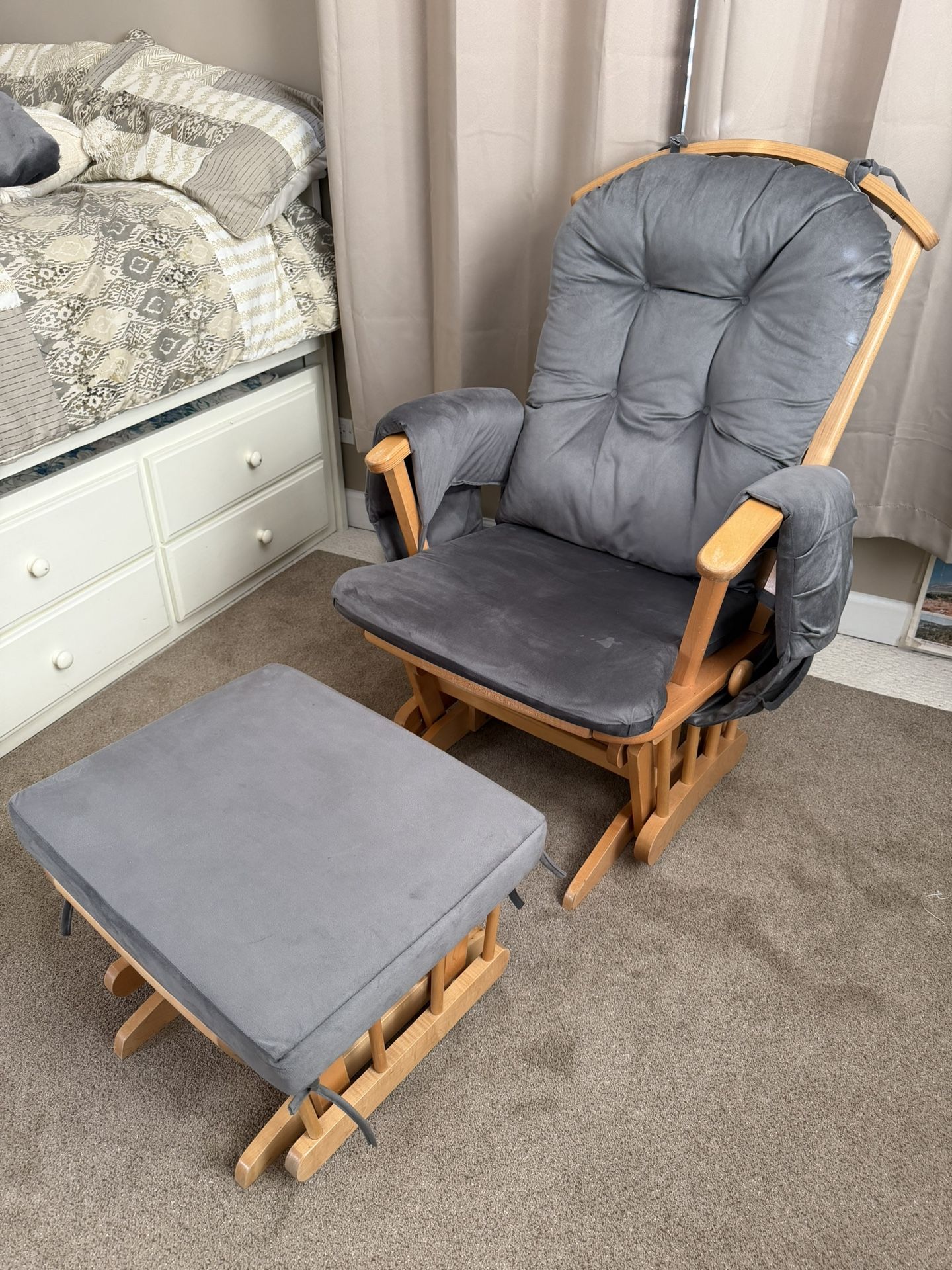 Cushions purchased last month. Smoke/pet-free home. Key features and details about Dutailier gliders include: * Origin and Craftsmanship: They are handcrafted in Canada, leveraging local woodworking traditions. * Construction: The gliders are built to last, featuring solid hardwood frames (such as maple or beech) and robust construction. * Gliding Mechanism: A signature feature is their exclusive, extra-long, and smooth gliding system, which uses high-quality sealed ball bearings for quiet operation. * Comfort: They typically feature high-density, thick cushions and padded armrests designed for comfort during extended periods, such as nursing or story time. * Functionality: Many models offer additional features like a multi-position lock mechanism to stop the glider in a desired position, swivel bases, and recline functionality. * Safety: The products are designed with safety in mind, featuring no sharp edges, toxic-free finishes, and compliance with safety standards.