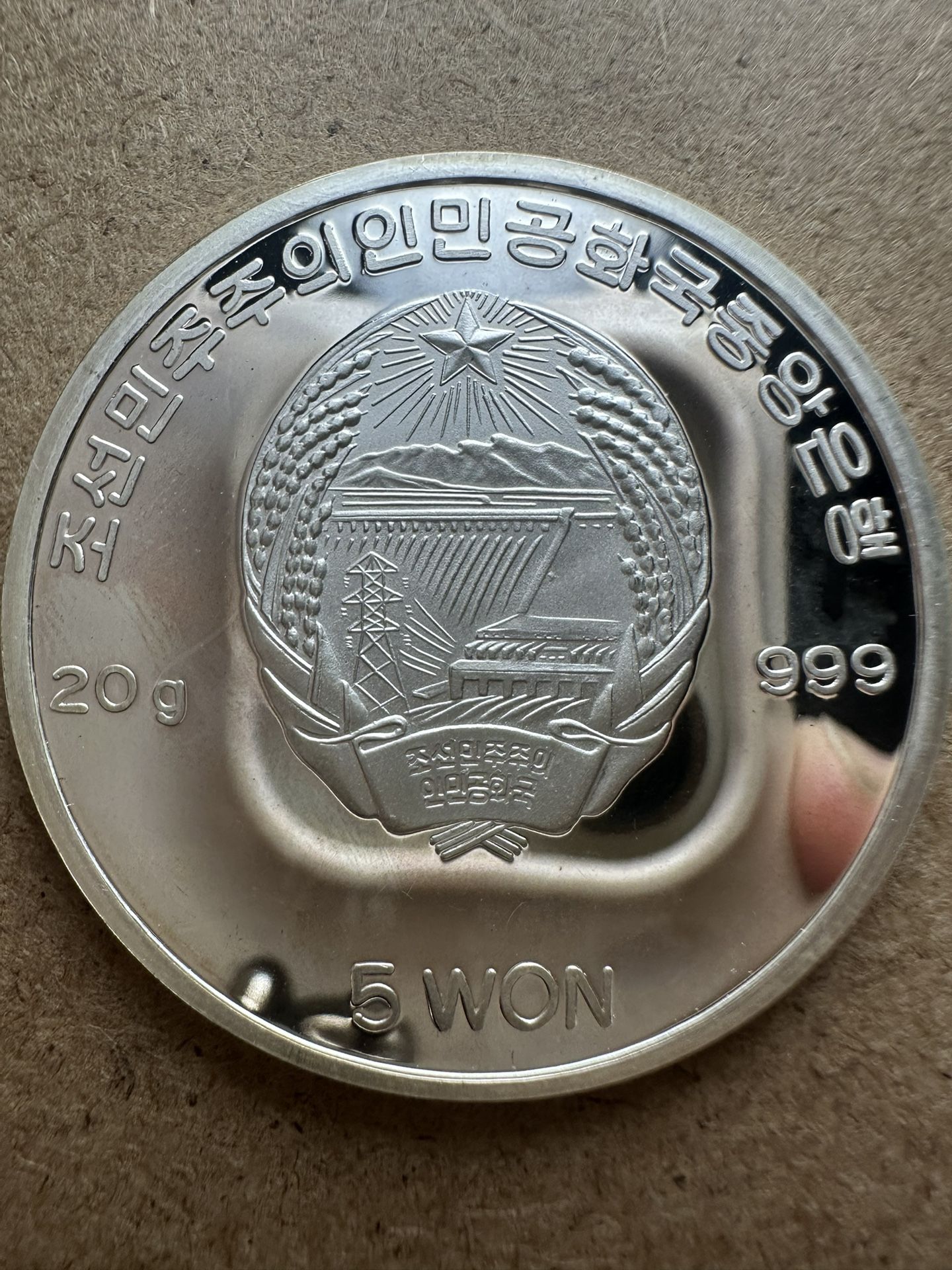 Issuer: Central Bank of the Democratic People's Republic of Korea. Composition: .999 Fine Silver. Weight: 20 grams. Design: Features the national coat of arms on the obverse. Translation 조선민주주의인민공화국중앙은행: Central Bank of the Democratic People's Republic of Korea 5 WON: 5 Won Proof Coin