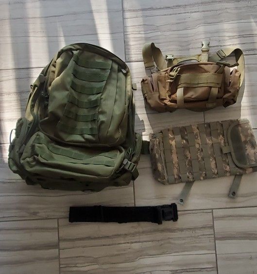 You get 1 large green molle style back pack along with 1 smaller coyote tan pack and 1 digital camo hydration bag (no bladder included) and 1 black webbed belt. Great for airsoft, paintball or a general go bag For pickup near 32ND st/shea