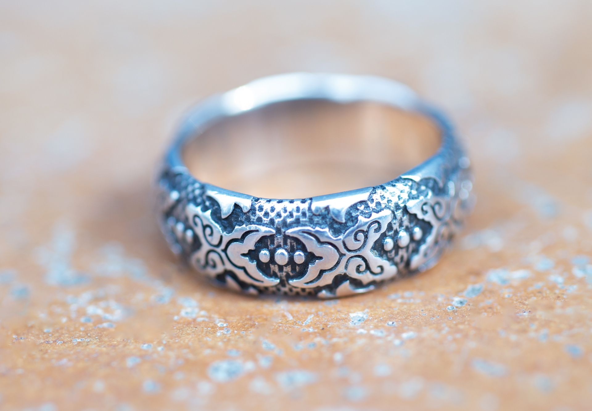 Unique, stylish, custom made wedding band (or just fashionable every day ring) with the Western flair. Nature design - inspired by Wyoming blossoms. Custom designed and hand cast to achieve highest standard. Palladium silver with antique finish. 8 mm wide, D shaped 7 and 1/3 (ring size) Made in U.S.A