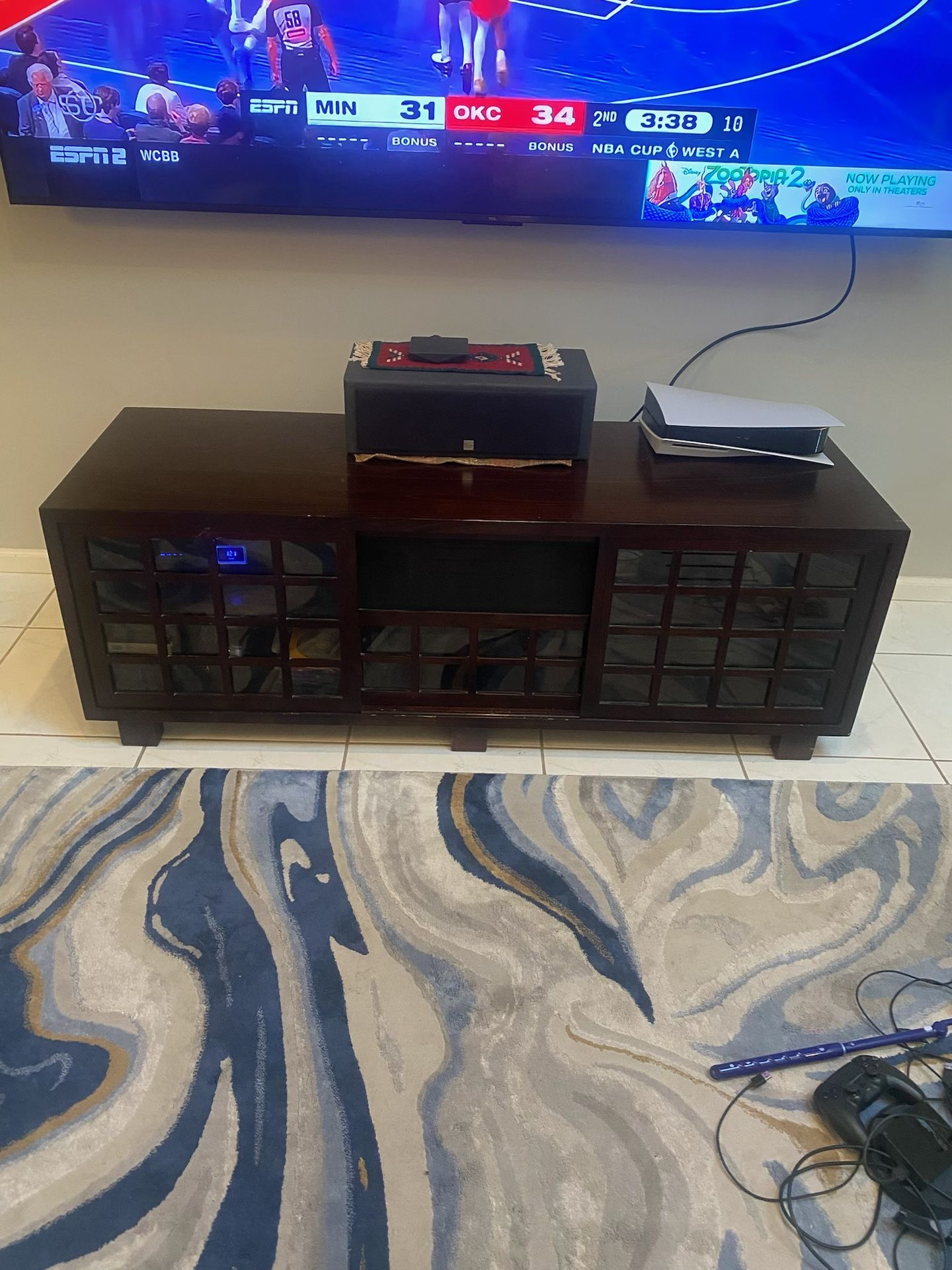 Beautiful Maria Yee solid wood media console made with high-quality craftsmanship and signature joinery. This piece includes multiple adjustable shelves and removable panel doors for ventilation or open display. Perfect for TVs, media equipment, gaming consoles, or decorative use. Details: • Brand: Maria Yee • Material: Solid wood • Color: Dark walnut • Dimensions: • 66” Length • 22” Depth • 23” Height • Includes: • Media console • Adjustable shelves • Removable ventilated side/back panels • Condition: • Structurally excellent • Some surface wear/scratches from normal use (shown in photos) • Very sturdy and heavy, quality construction Features: • High-end woodworking with exposed joinery • Excellent storage for receivers, amplifiers, gaming systems • Ventilated shelves for airflow • Removable doors/panels for easy access • Timeless modern design Retail Price: $2,495