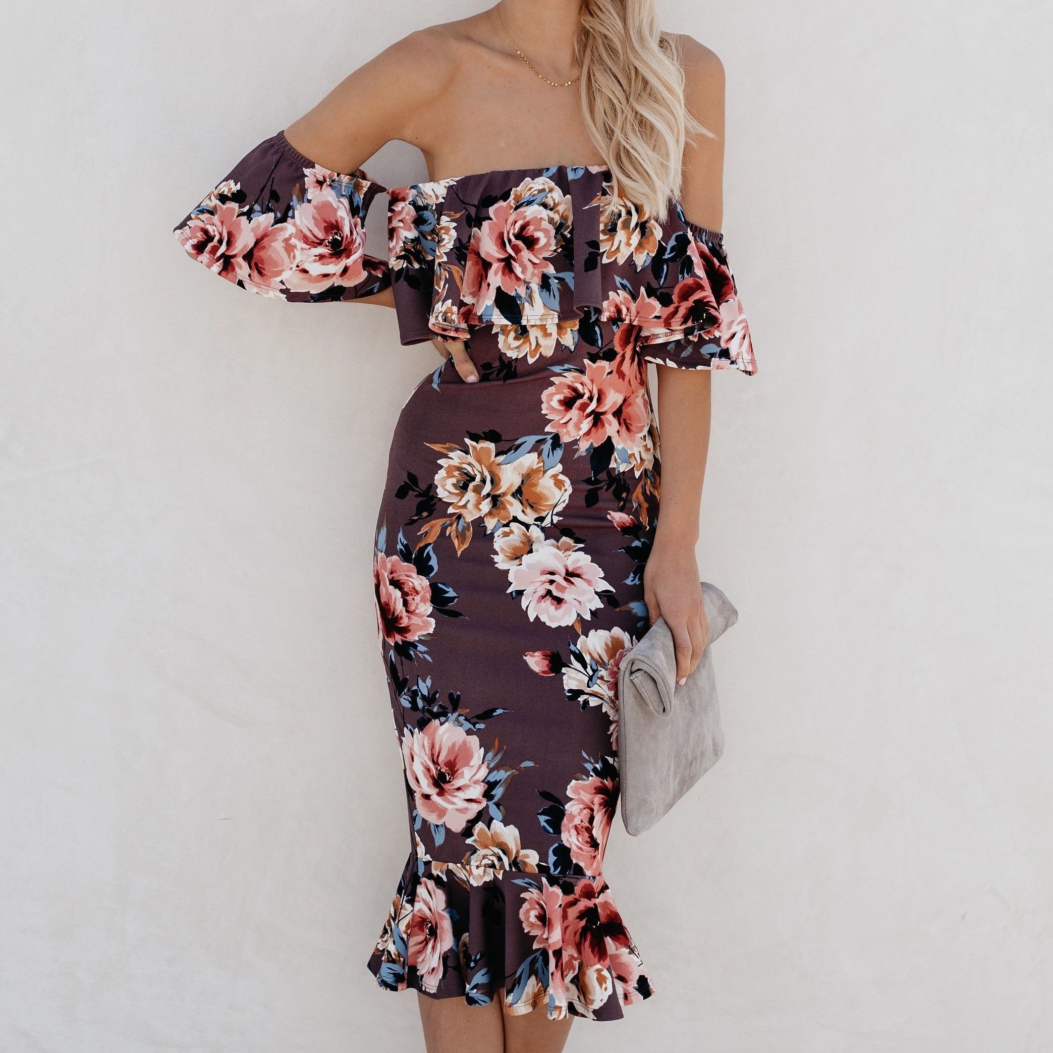 In great condition with no signs of wear. Floral print on a burgundy background. Ruffle off the shoulder neckline, a ruffle hem, and a bodycon silhouette. Material is stretchy. Size Large and can fit a medium or a large.