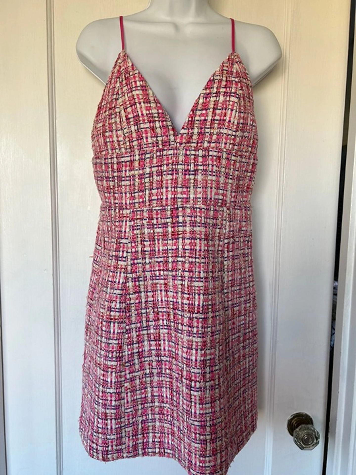 NWT House of Harlow 1960 Pink Tweed Zipper Back V Neck Fitted Mini Dress Large