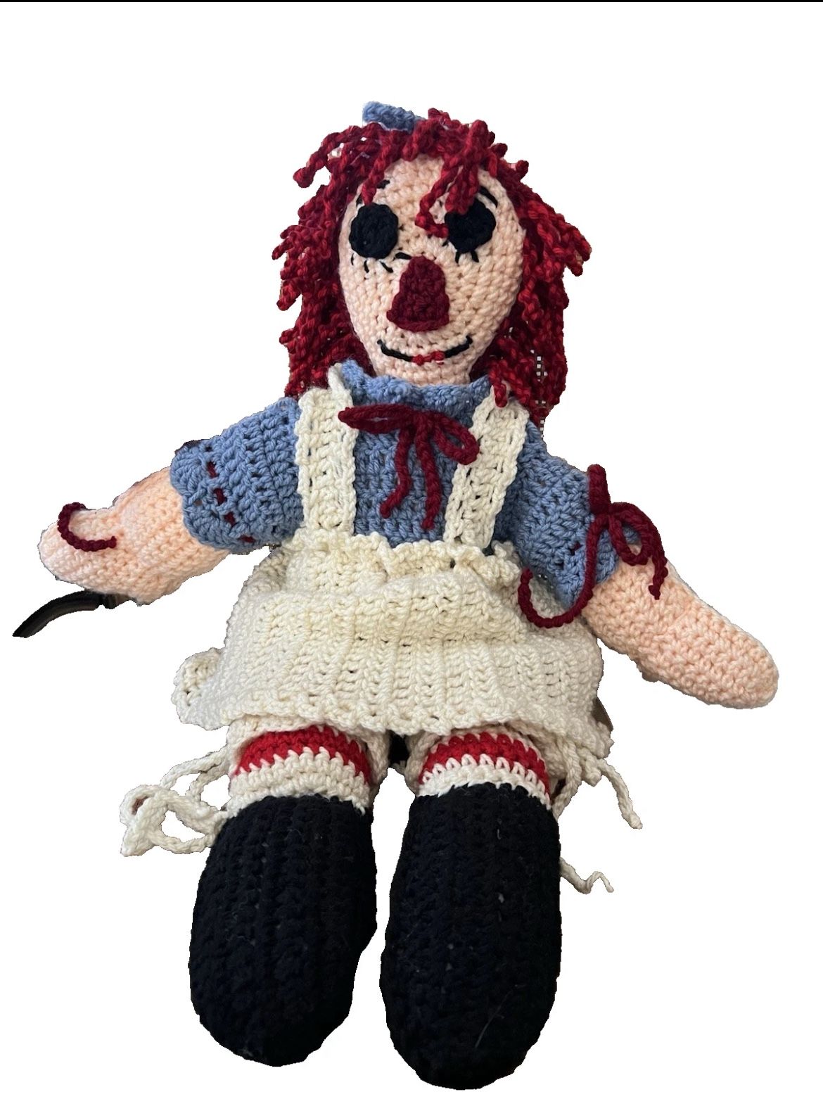 This Vintage Hand Knit 26" Raggedy Ann Doll is a collectible handmade crocheted doll featuring red curly hair, a light complexion, and black eyes. Perfect for all occasions, this unique doll is made from yarn and reflects the character of Raggedy Ann. Crafted in the United States, this original piece is a special addition to any doll collection, showcasing the timeless charm of handmade craftsmanship. OOAK Hand Crocheted. Great for Raggedy Ann Collectors. Super Clean. Collectible. Please zoom into pictures as they are a huge part of my description. Exactly as pictured. I do love positive feed back and I am available for questions anytime. I wrap my items securely and I do offer combined shipping upon request:)
