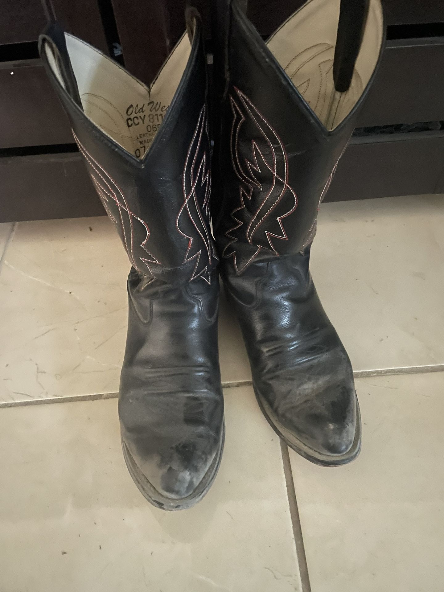 Black cowboy boots children’s size 5 genuine leather exterior faux leather interior. The interior is cracked. Scuffed exterior. The heel broke on the right one so they are no longer the same height.