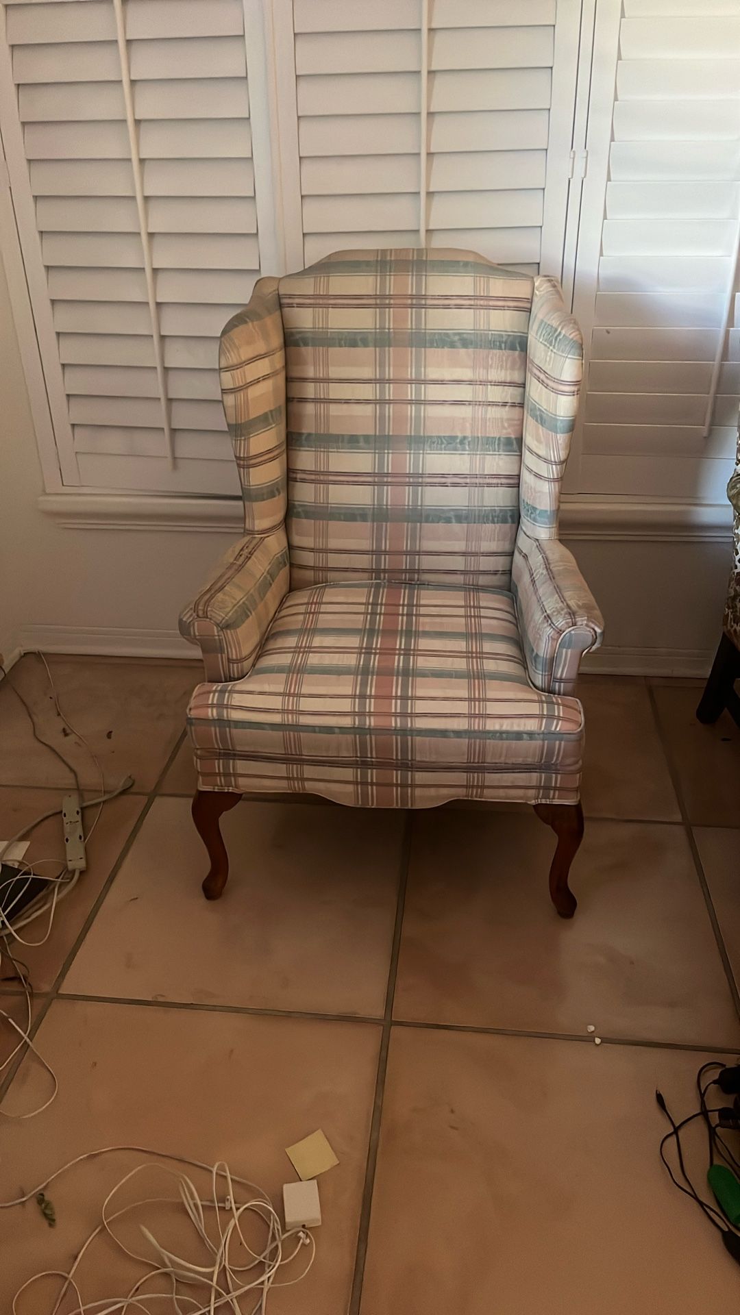 Wing back chair upholstered- removable cushion.48 inches highest point. A classic addition to a living room. Quality furniture.