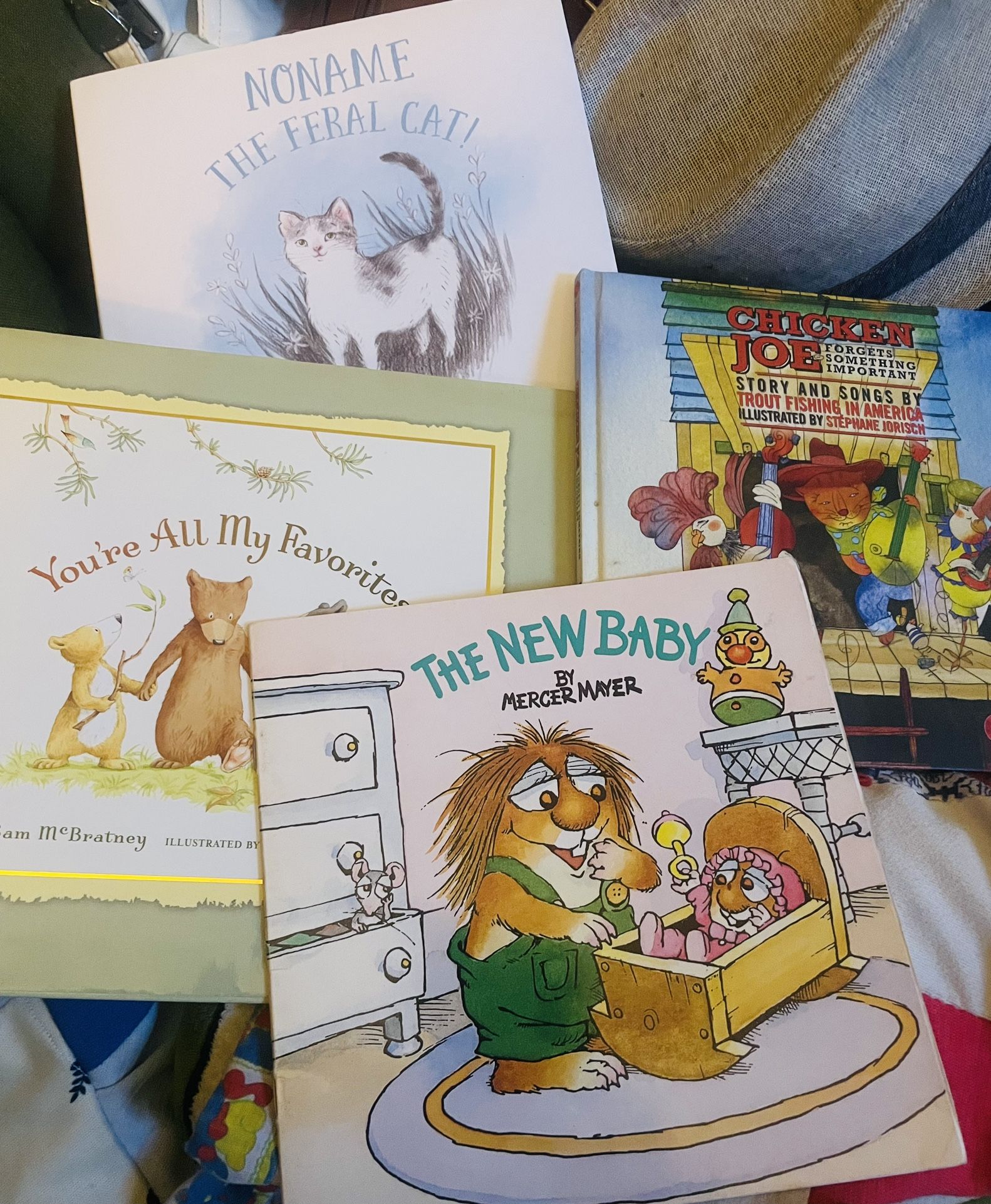 This engaging collection of children's books includes "My New Baby" by Mercer Mayer, "Chicken Joe," "You're All My Favorites," and "Noname the Feral Cat." Each book offers a unique perspective and valuable themes for young readers. My New Baby: This book helps prepare children for a new sibling, addressing feelings of excitement and curiosity with relatable illustrations and simple text. 2. Chicken Joe: Follow the adventures of Chicken Joe in this humorous tale that emphasizes friendship and self-acceptance, making for an entertaining read. 3. You're All My Favorites: This heartwarming story reassures children about parental love, highlighting that each child is equally cherished, perfect for family discussions. 4. Noname the Feral Cat: This touching tale follows a stray cat’s journey towards belonging and acceptance, fostering empathy and compassion for animals in young readers. Overall, this collection offers a balanced mix of adventure, family dynamics, and life lessons, making it an ideal addition to any child's library. Each book provides meaningful narratives that can spark conversations and foster understanding in young minds.