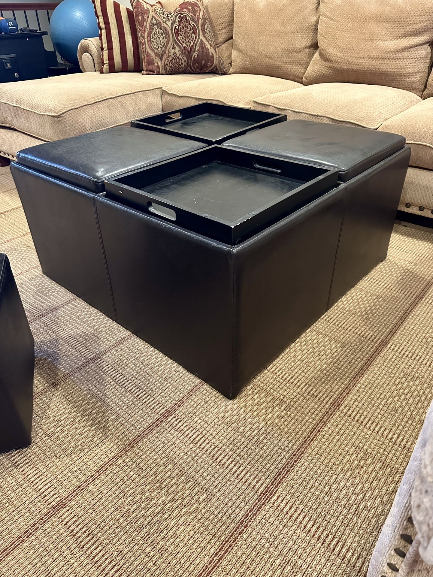 Square ottoman with 4 stools that fit inside. 37.5” x 37.5” 19” high Stools are 15” x 15” x 13”