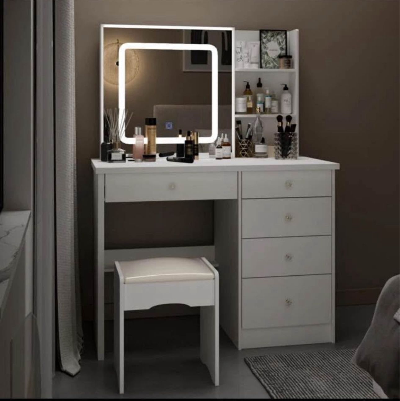 White Vanity set with mirror, light, and stool 3 light mode 5 drawers