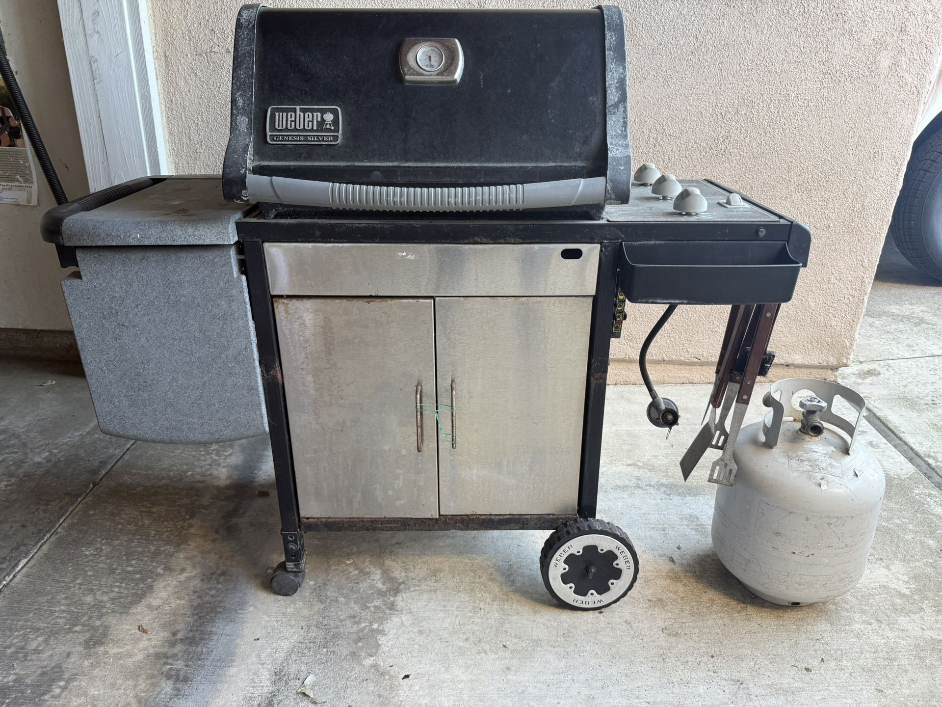 Comes with full propane tank, BBQ utensils, black cover, owners guide pages. Neighbors just do not use it anymore and they are spring cleaning.
