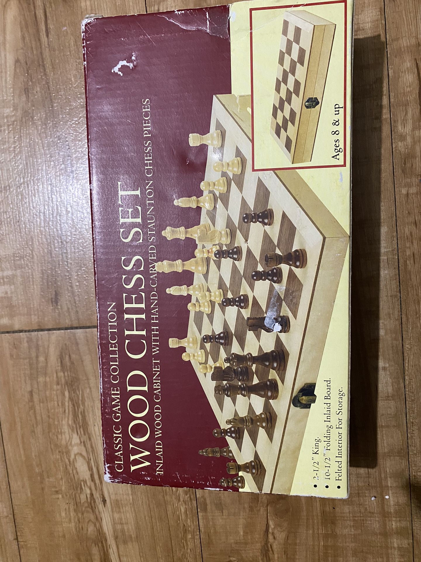 Wooden Chess Set. Never used, in box.10” by 1&1/2” folding board. Wooden pieces. Felt lined box.