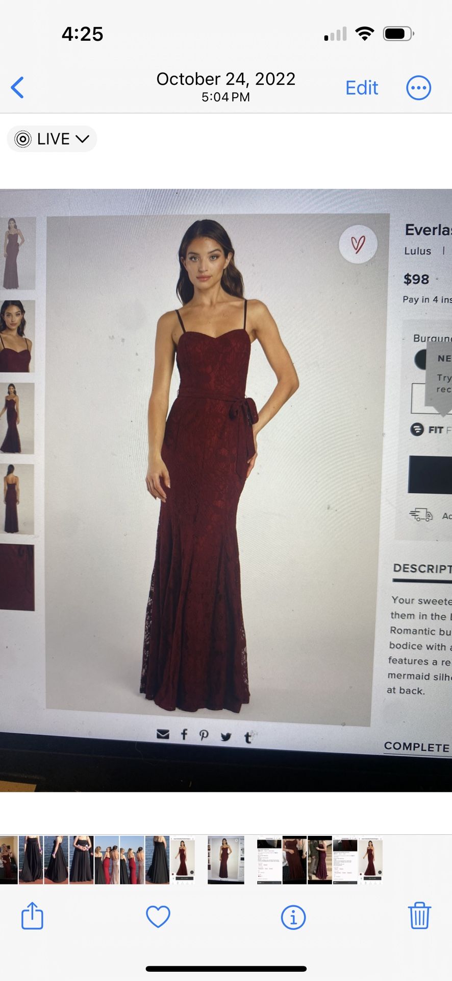 Burgundy Mermaid dress Lace Large I'm 5'4" and wearing heels for a better idea Great for prom, weddings, and many other formal events Only worn once, like new Non smoking house