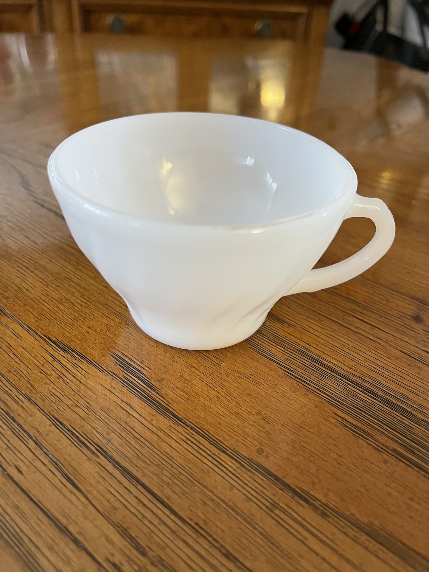 Anchor Hocking Swirl Pattern Milk Glass Tea Cup - Says Suburbia Oven Proof on Bottom Condition: Good (Normal wear and tear) Bottom is hard to read, but I believe it says Anchor Hocking - Suburbia Oven Proof - Made in U.S.A. Dimensions: Approximately 3.75” across top lip (not including handle) x 2.5” high Hard to see in the pictures, but the outside sides have a swirl pattern Price: $7.00