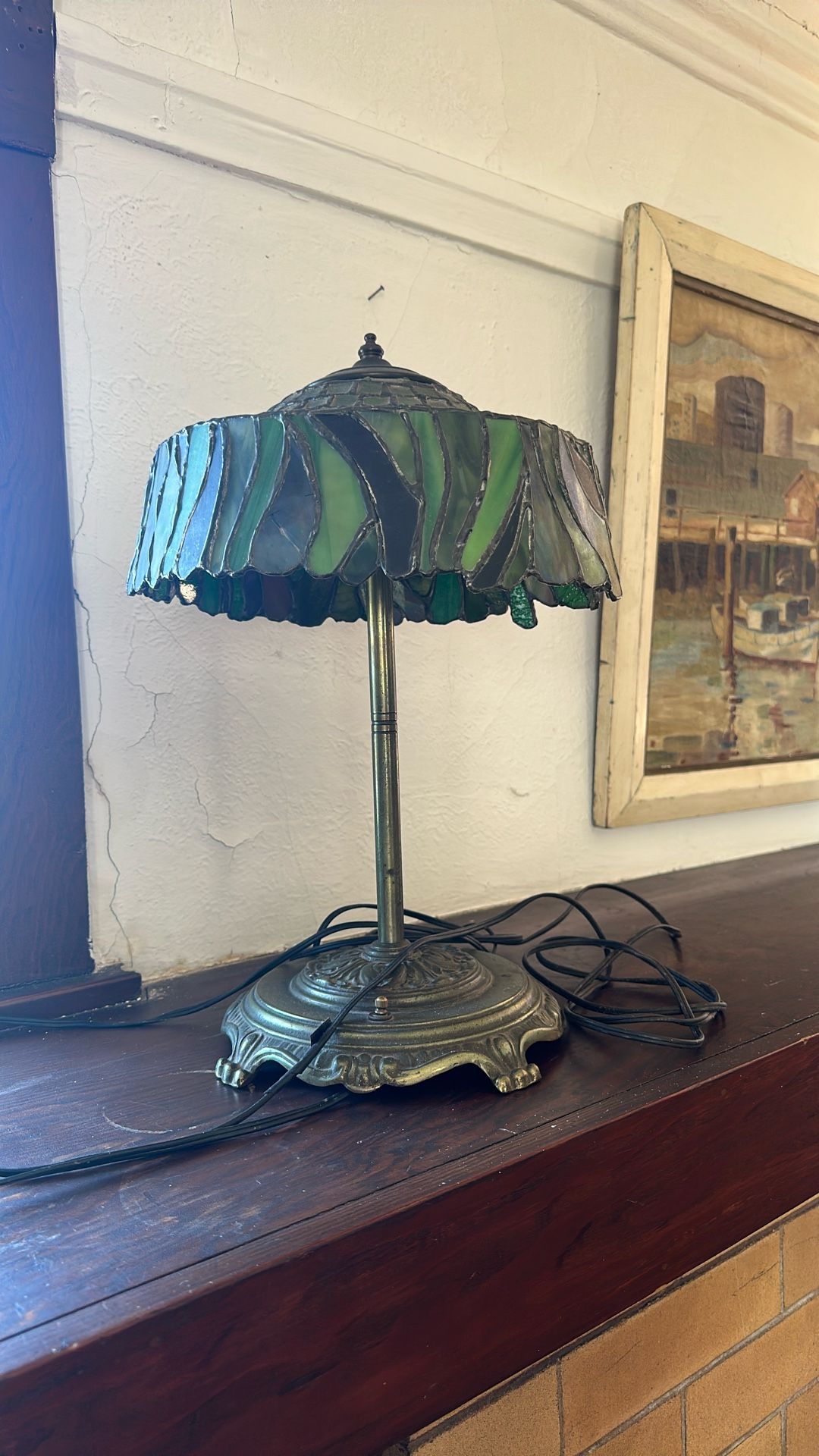 Vintage Green Slag Glass Table Lamp – Tiffany Style Ornate Brass/Bronze Base – Works!