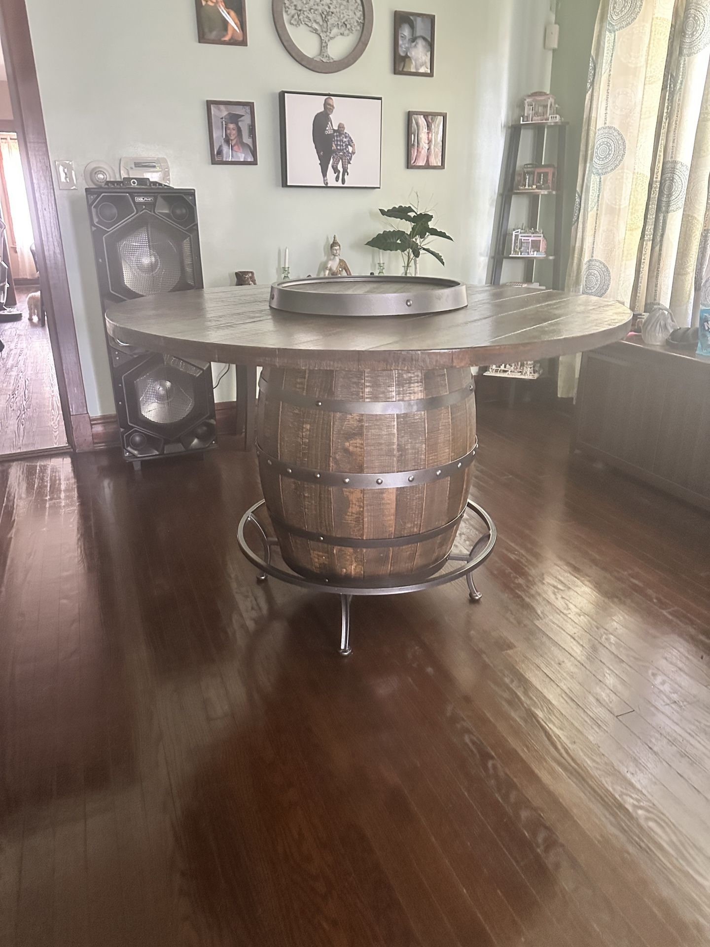 ESP/ENG super gorgeous statement piece for any dining room, basement, or bar. barrel serves as storage and lid serves as a lazy suzan! remodeling home so this table is no longer needed, retails for $1599 table is in great condition and has been owned for ~2.5 years. Please view images for condition of table. Please message me for additional questions or details. CROSSPOSTED PLS MESSAGE FOR AVAILABILITY