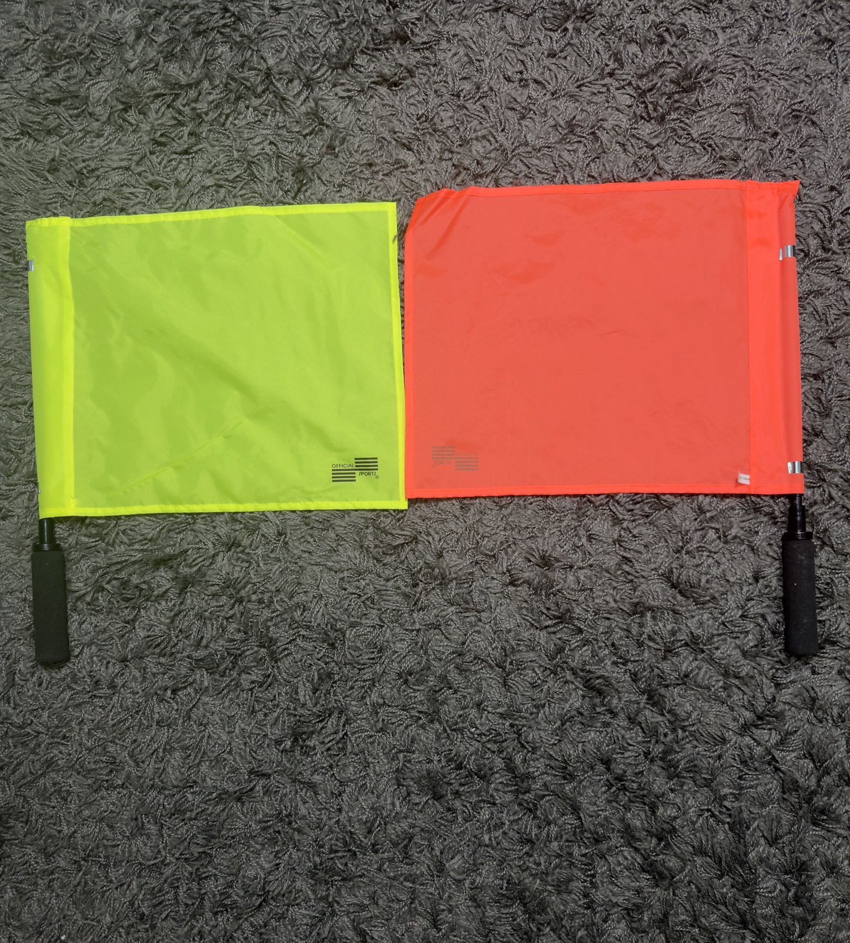 Set of two soccer referee / assistant referee (linesman) flags by Official Sports. Includes one neon yellow and one orange flag with comfortable foam handles.