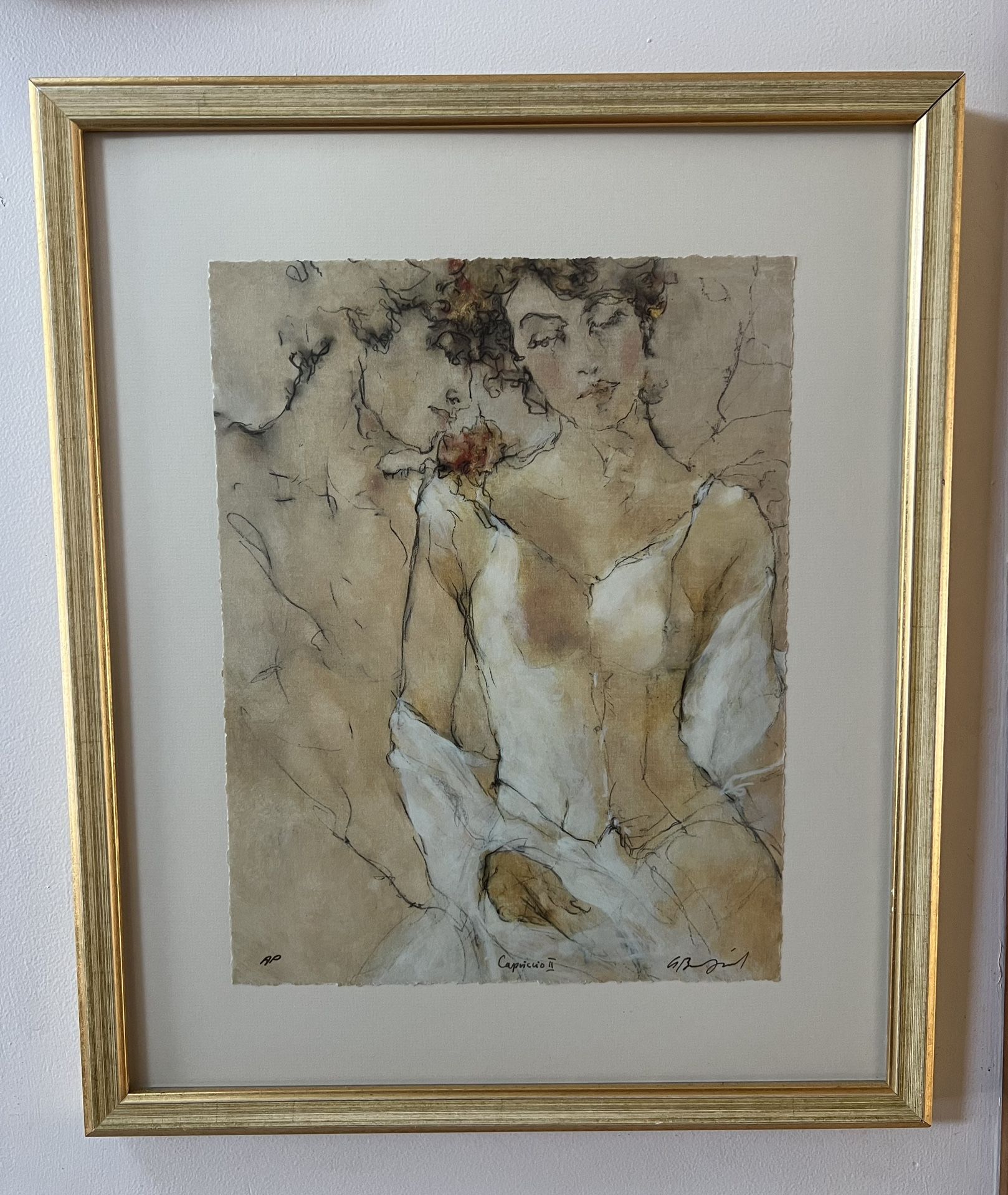 Gary Benfield (England: B. 1965) serigraph in colors on paper titled "Capriccio II”Hand signed, titled and A/P in gold metallic to lower left. Measures approximately 21.5” X 18” X 1.25” This is an absolutely stunning serigraph by Gary Benfield. It is hand embellished. It has been custom framed & matted and they accent the serigraph perfectly. It is hand signed, and hand numbered limited edition. It is in very good condition Artist: Gary Benfield Title: Gary Benfield, “Capriccio II” This romanticized piece depicts the tender embrace between a man and a woman. Ready to hang Please review all photos as they are part of the description.