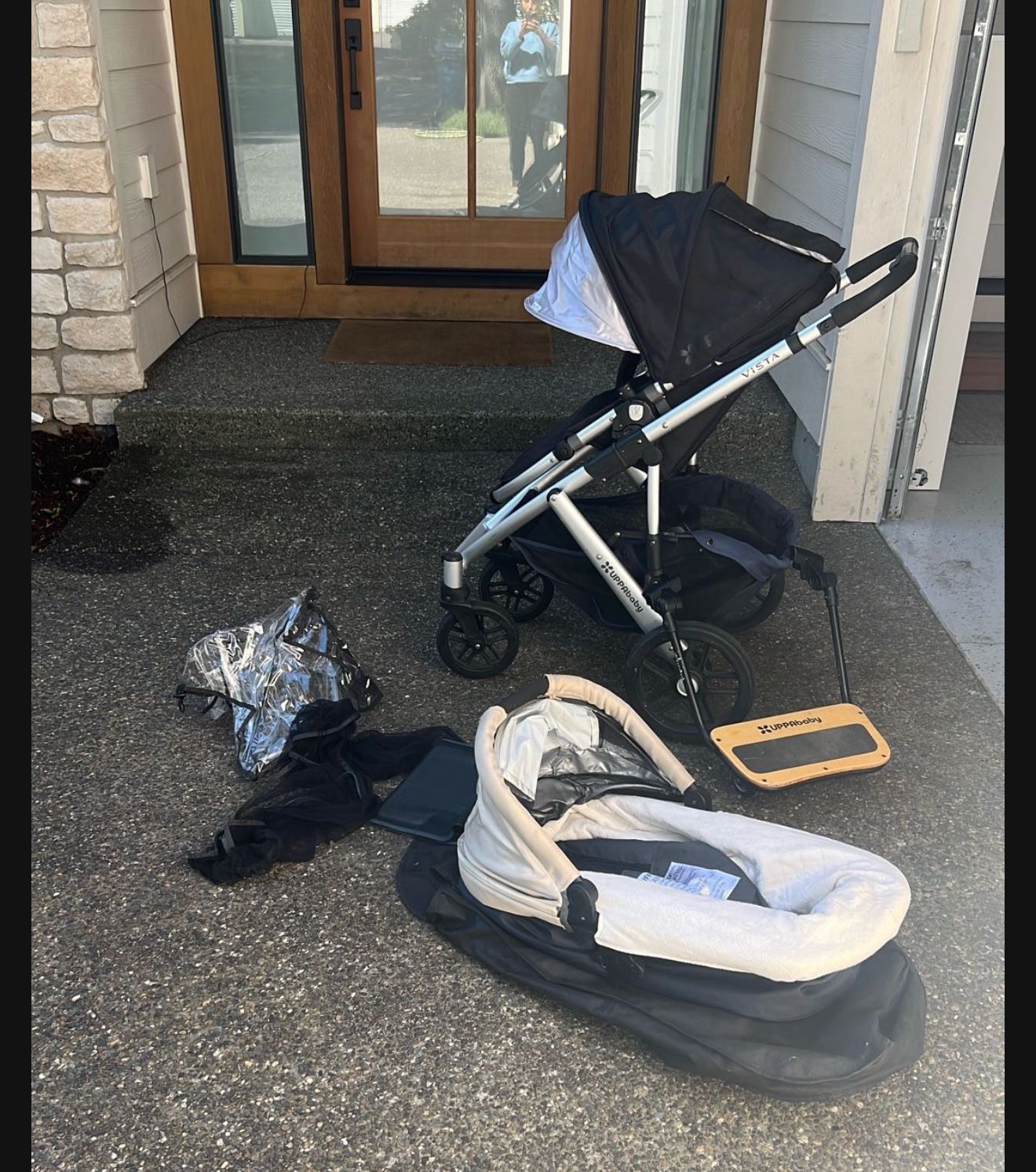 Can be used as Single, Double Or Triple Has bassinet, toddler seat, rumble seat, and piggy back board. Seats are both black, that’s just an example photo I found of how it can set up as a triple stroller.