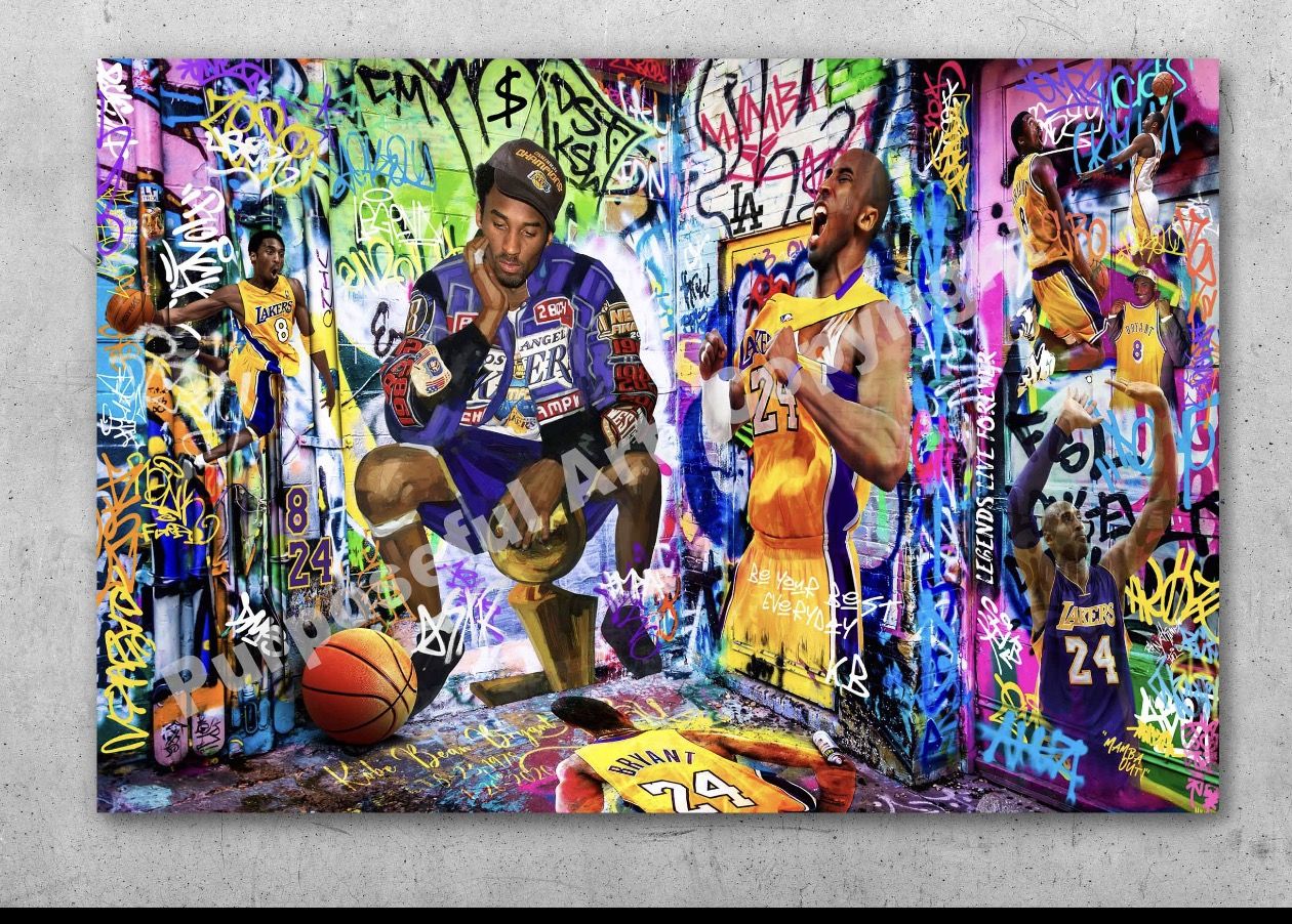 Stunning, high-quality canvas featuring a bold tribute to Kobe Bryant in a colorful urban graffiti style. This eye-catching piece showcases multiple iconic moments from his Lakers career, including his #8 and #24 jerseys, set against a vibrant street-art background full of energy and detail. The artwork captures Kobe’s passion, intensity, and legacy — perfect for any basketball fan, Lakers supporter, or sports memorabilia collector. The colors are bright and dynamic, making it a true statement piece for a living room, game room, office, gym, or man cave. ✔️ Gallery-wrapped canvas ✔️ Ready to hang ✔️ Excellent condition ✔️ Makes a great gift A powerful tribute to a legend — “Mamba Forever.” Message me if interested!
