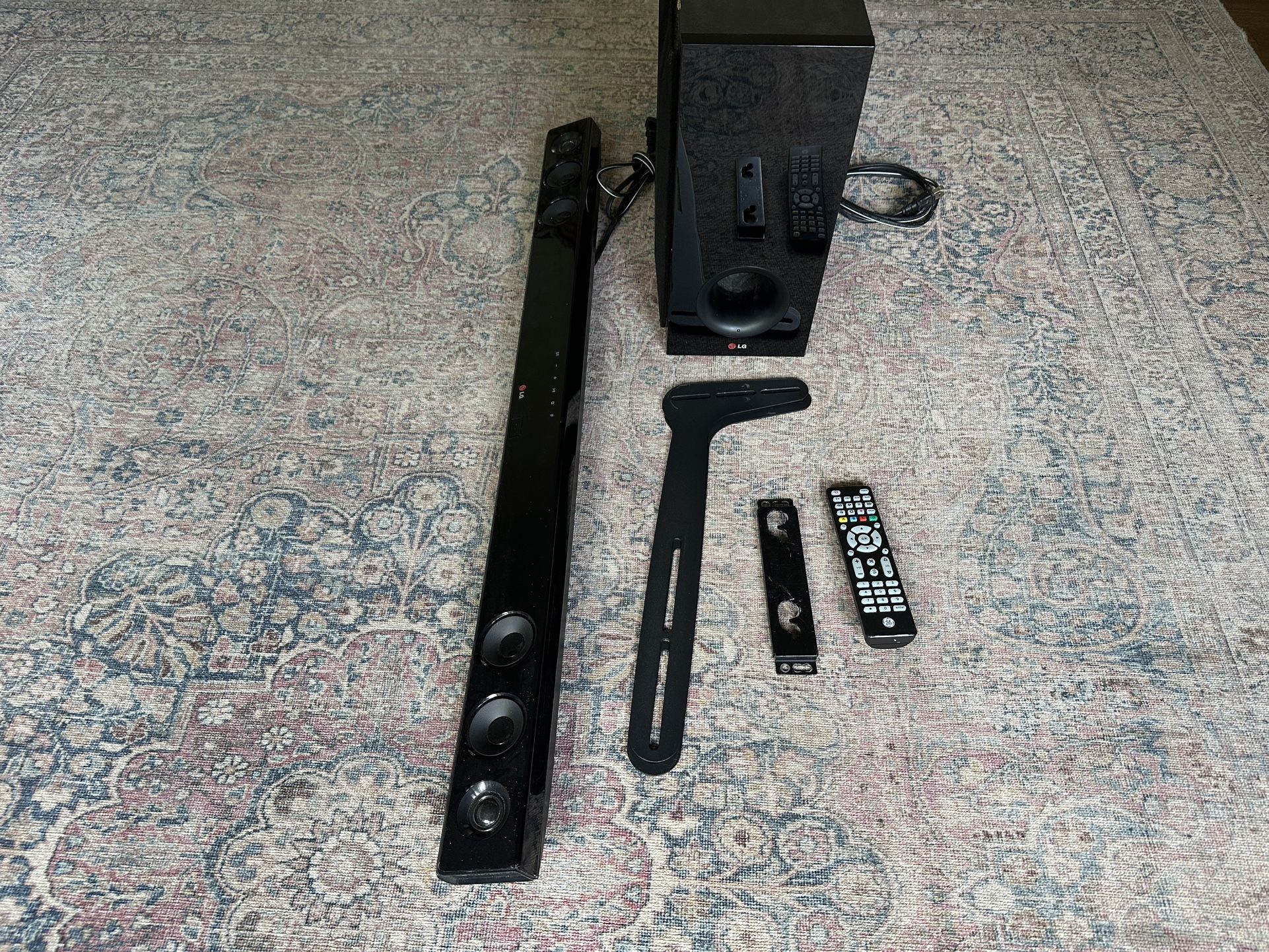 LG Sound bar & Wireless Subwoofer with light wear and tear. Supports Dolby Digital, Bluetooth pairing, optical input and HDMI with dts 2.0. Comes with GE universal remote that pairs with most TV’s. Included items: Sound bar - model NB3530A Subwoofer - model S33A1-D Sound bar wall mount Sound bar adjustable tv mount GE universal remote