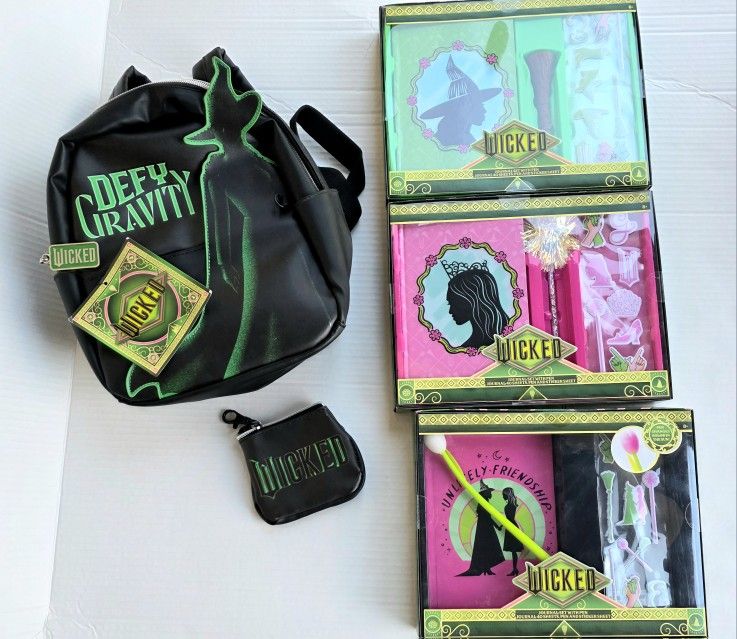 This bundle includes 1 Elphaba Wicked small backpack with coin bag and keychain as shown in picture, plus 1 notebook set of Glinda, 1 notebook set of Elphaba and 1 notebook set of Elphaba and Glinda together. Original Wicked movie brand. #wicked #Glinda #Elphaba #WickedMovie