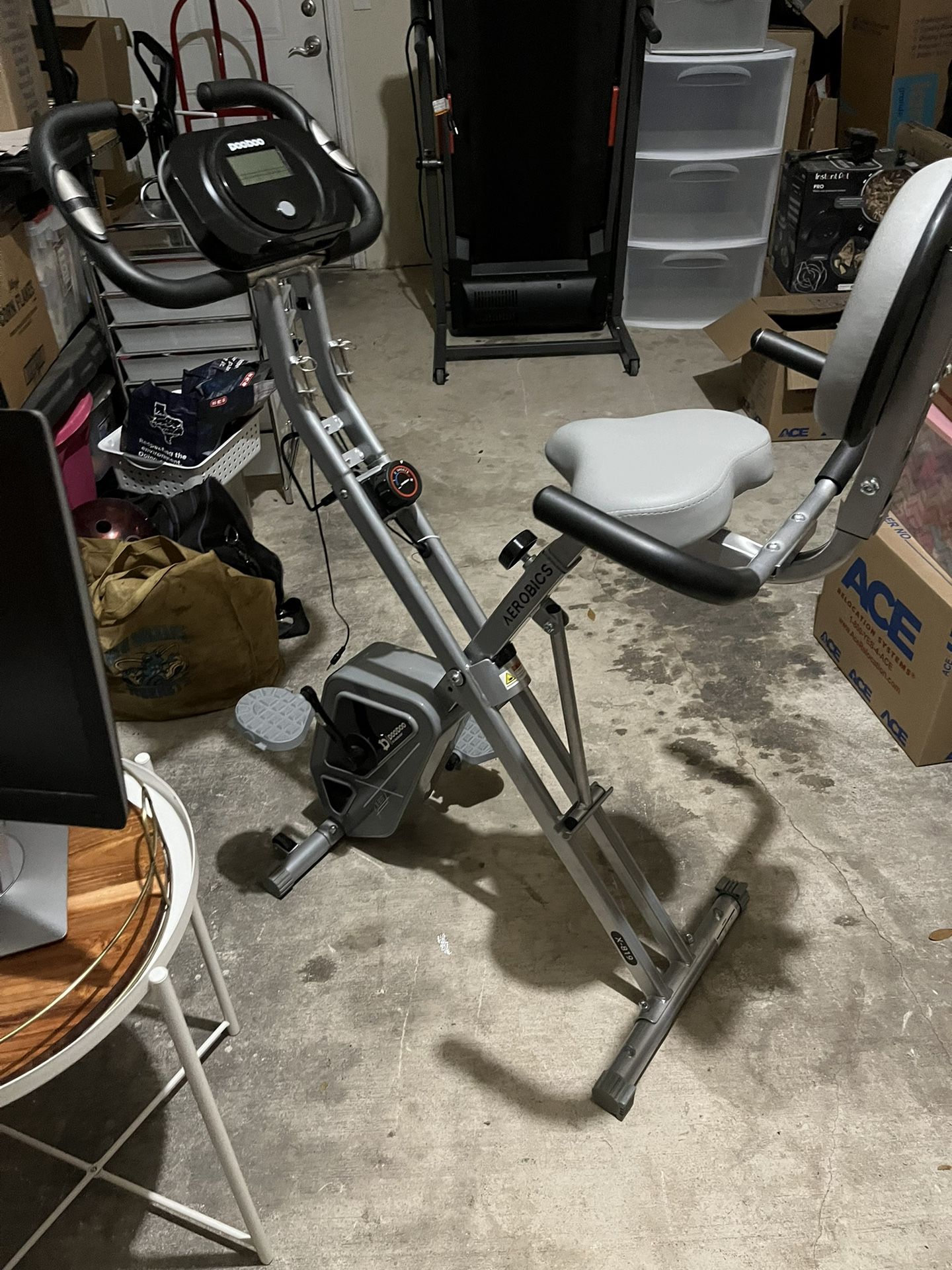 pooboo Folding Exercise Bike, Foldable Fitness Stationary Bike Machine, Upright Indoor Cycling Bike, Magnetic X-Bike with 8-Level Adjustable Resistance, Bottle Holder & Back Support Cushion for Home Gym Workout Used but in excellent condition.