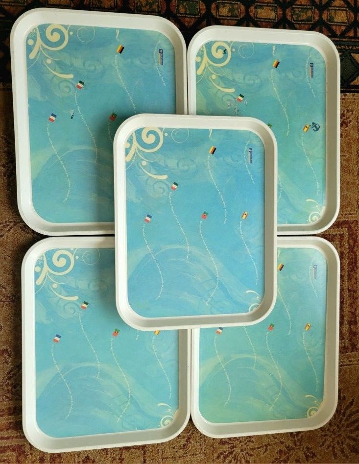 5 Royal Caribbean International 18x14 Room Service Trays. Versa Camtray Sturdy Hard Molded Plastic. Royal Caribbean Logo on Trays along with flags from many countries. Cannot purchase in retail market. RARE, and not used on ships anymore.