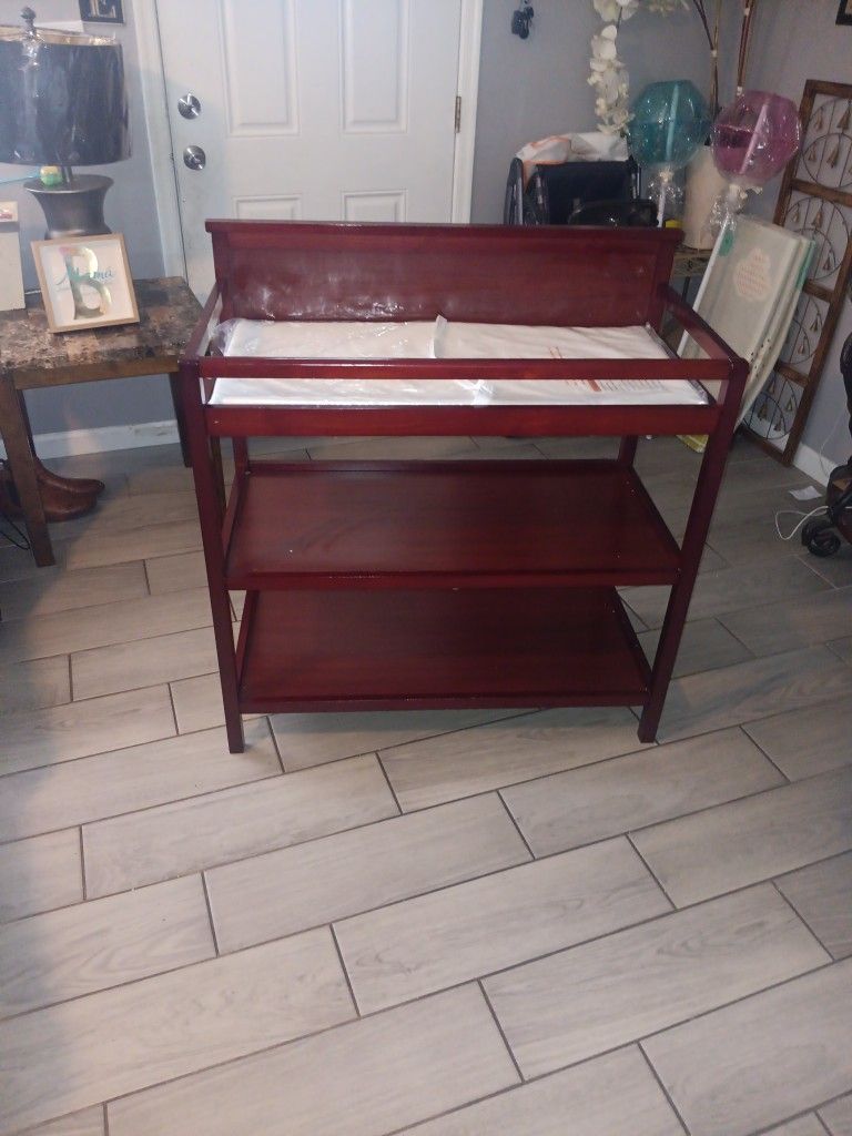 In like great new condition. Some wear but still in perfect condition. Cherry wood color.