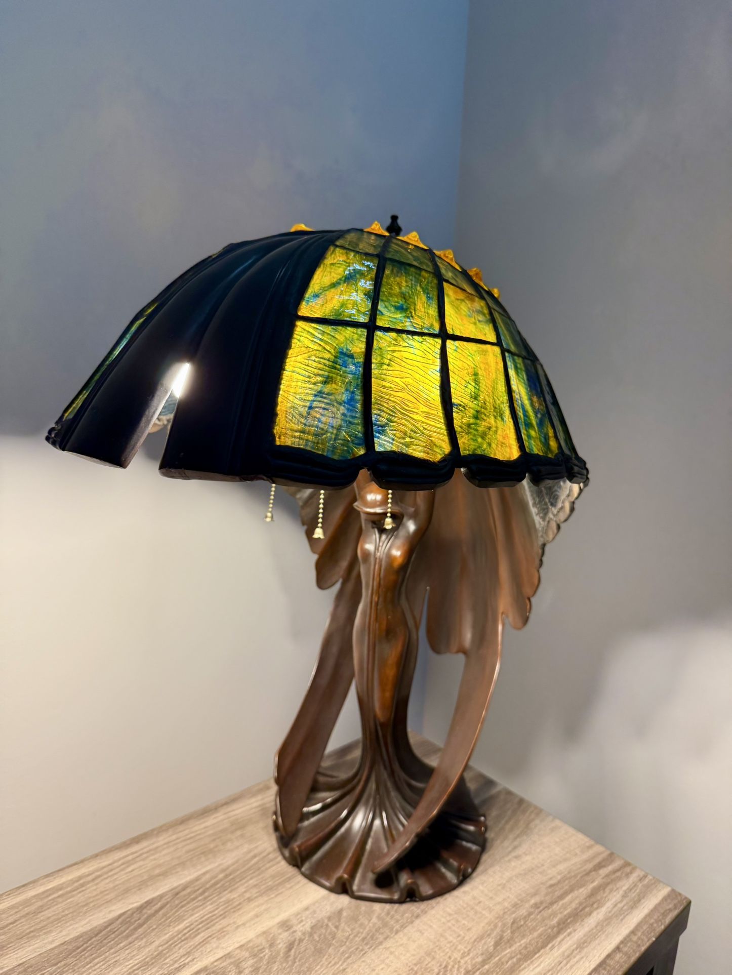 This is an Art Nouveau or Jugendstil "Flying Lady" figural table lamp, originally designed by Peter Behrens around 1902. The lamp features a bronze base sculpted as a female figure with flowing drapery that holds a stained glass shade. The original design is a classic example of the Art Nouveau style, combining sculpture and light. The lamp is also known as the "Goddess Lamp" or "Tiffany style" due to its design. Reproductions are common, often mass-produced with variations in materials and size. Originals and high-quality reproductions can be valuable collector's items