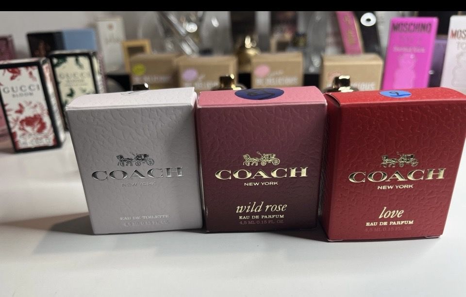 New. With Boxes. Dabbers. Splash. 4.5ml 0.15fl oz You Get 3 Coach mini Perfumes. Coach New York "Love" EDP Travel Size Coach New York "Wild Rose" EDP Travel Size Coach New York EDT Travel Size