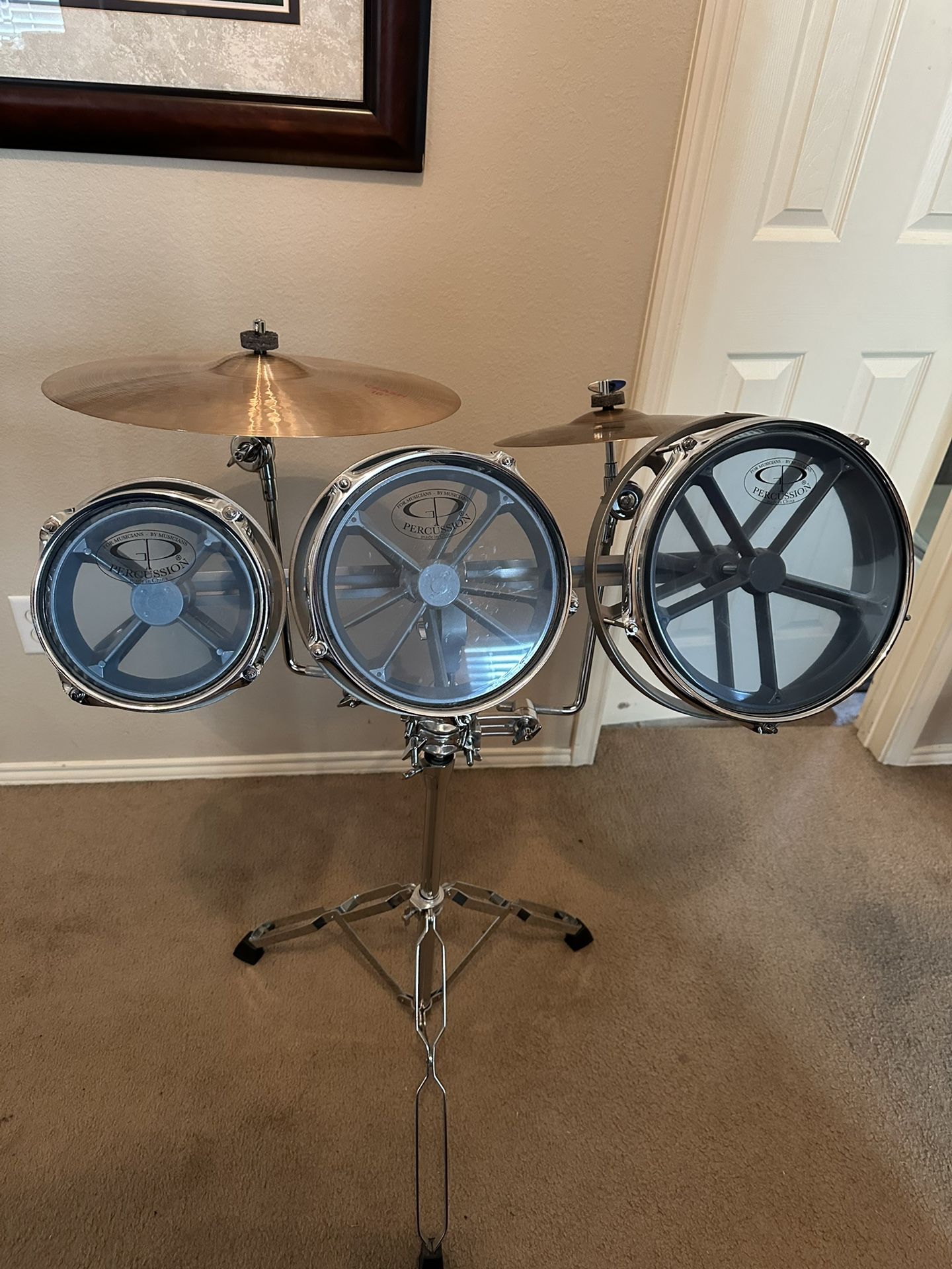 Selling my Cardinal Percussion Spin-tuned Tom Set with Stand - 6/8/10 inches. And has the Crash and splash cymbals. The large crash cymbal alone is over 300 new and these are in perfect condition. Also comes with a drum pad and sticks. Asking $500for everything. Thanks.