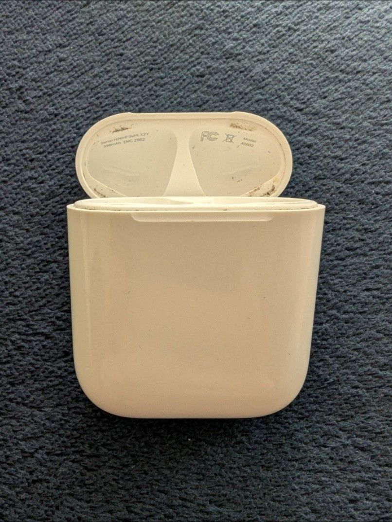 This is an AirPods case which does not include the AirPods themselves. It does not have wireless charging. It holds a charge just fine via Lightning. The case has some dirt/light scuffs on the top inside of the case (see pictures). There is little to no dirt in the holes themselves for the AirPods. I can clean it further before shipping if you like at no extra charge.