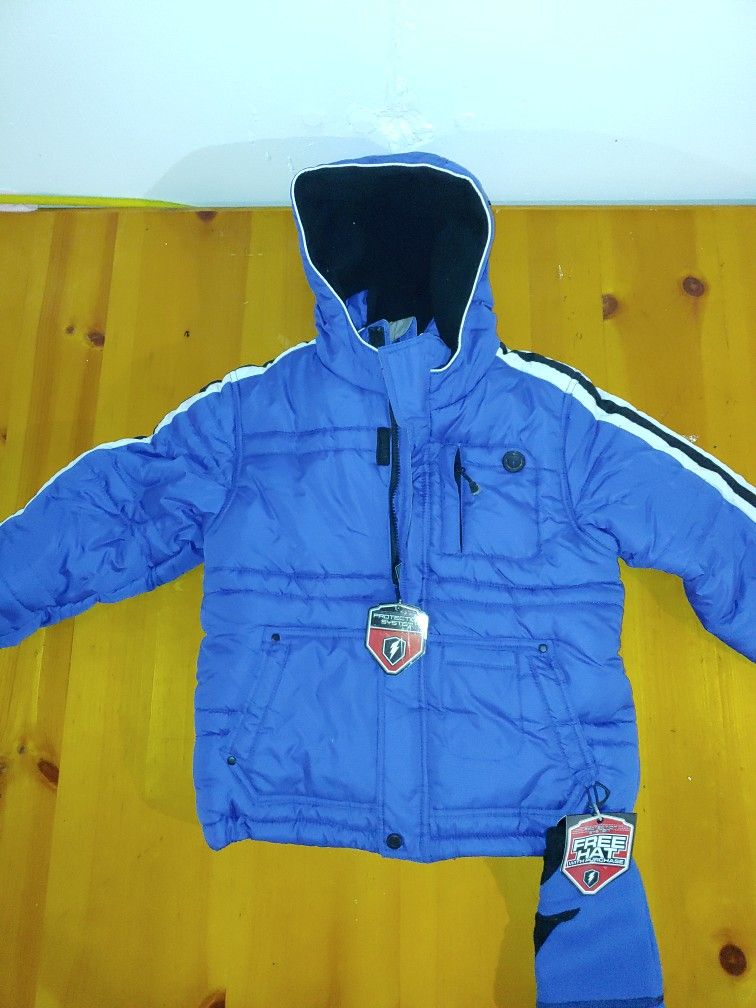 New boy winter jacket. Blue black and white with free fleece hat. Boys size M 6