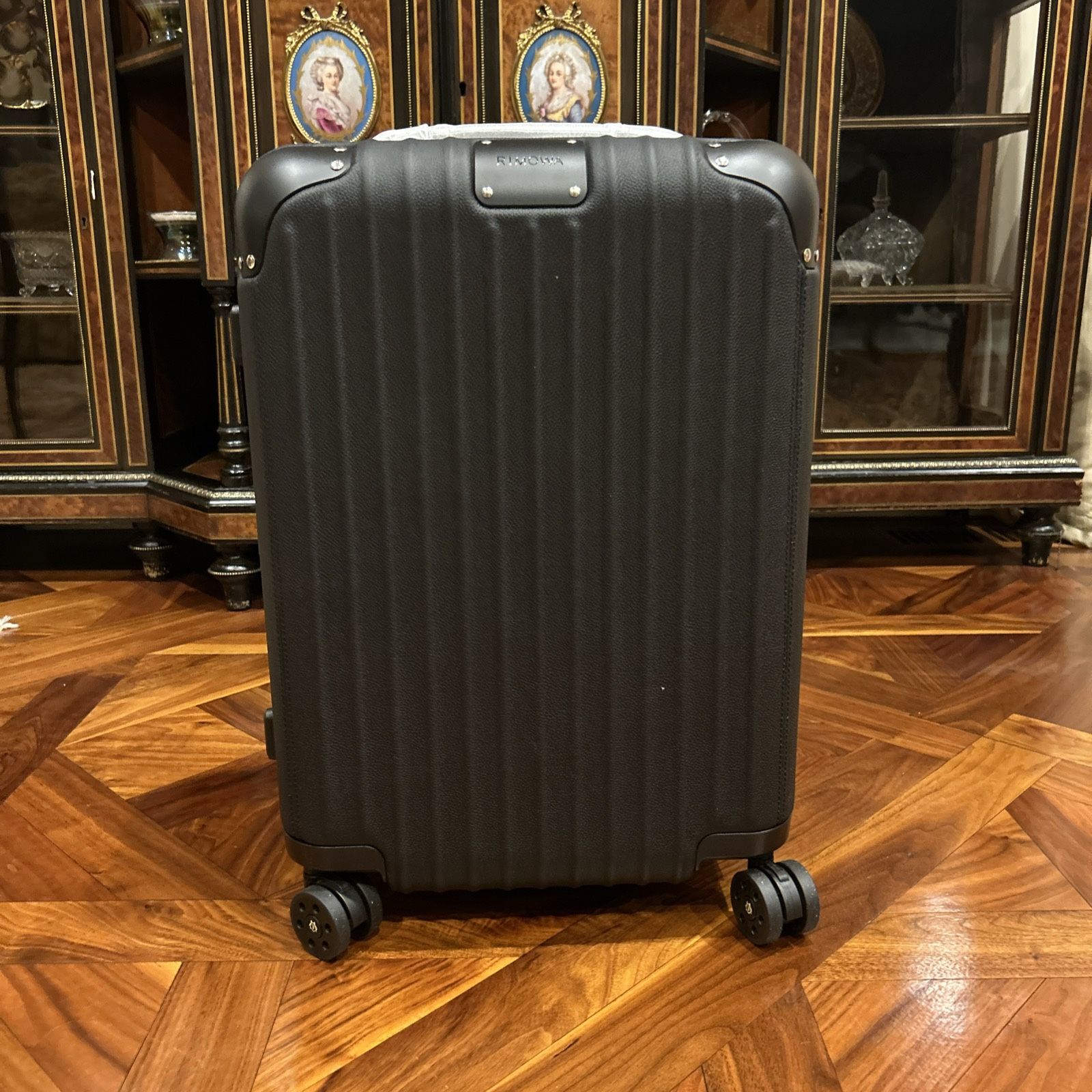 This a original rimowa distinct with black sleek features that include beautiful leather and aluminum finishes
