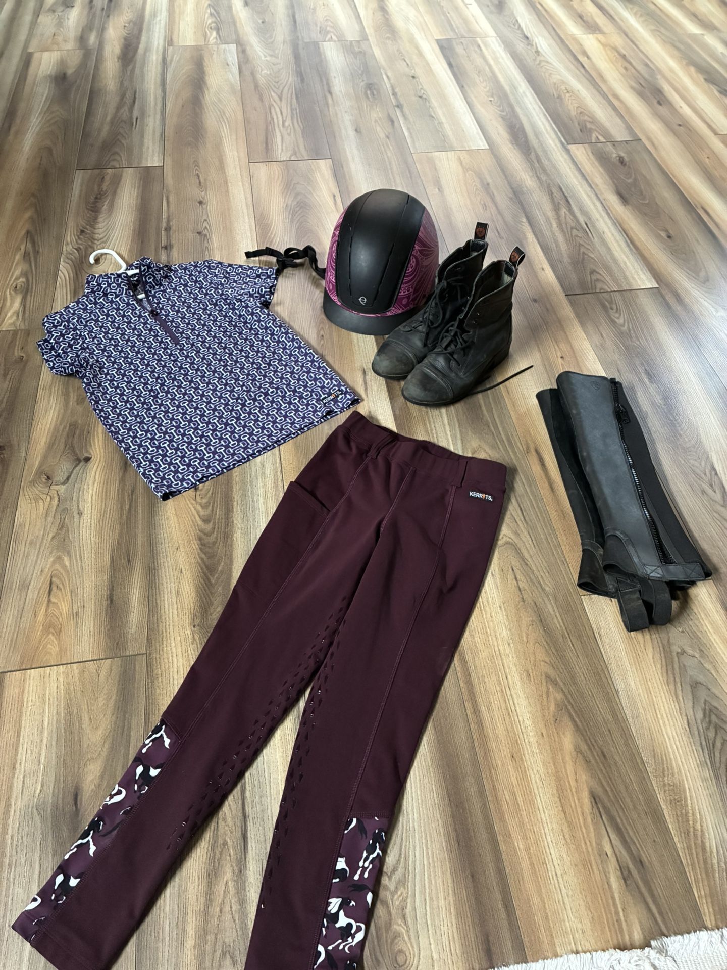 Kerrits full seating pants, shirt NEE ( youth medium). Youth adjustable helmet ( Troxel), Ariat boots size 3, Ariat youth Scout chaps size LT ( like new). All for $100 This is over a $250 value. Will not respond to offers below $100.