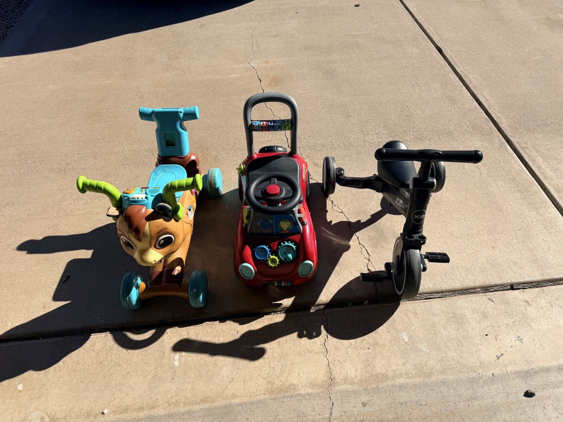 $10 red car $10 horse $10 balance bike/ tricycle (can adjust how the wheels sit)