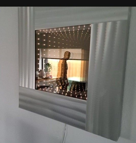 Infinity Square Mirror. Metalic silver frame see pictures for details . Some scuffing. Minor lift on upper left at top. See pictures for details.Pick up near Metro Zoo. Deerwood Village Miami, Fl.