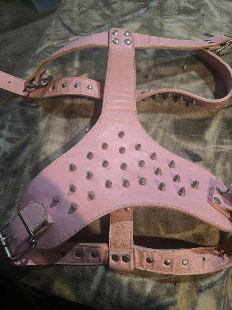 Pink spikes for your large girl. Purchased for a Doberman/Mastiff mix. Leather harness in great condition.