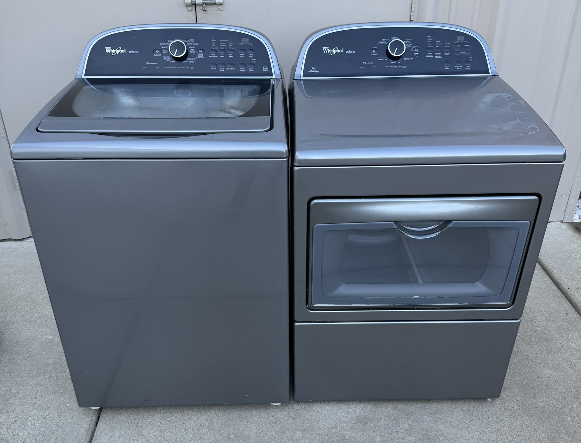 Whirlpool top loader washer and dryer. Stainless steel color. No issues at all. Dryer is electric. Can deliver for a fee