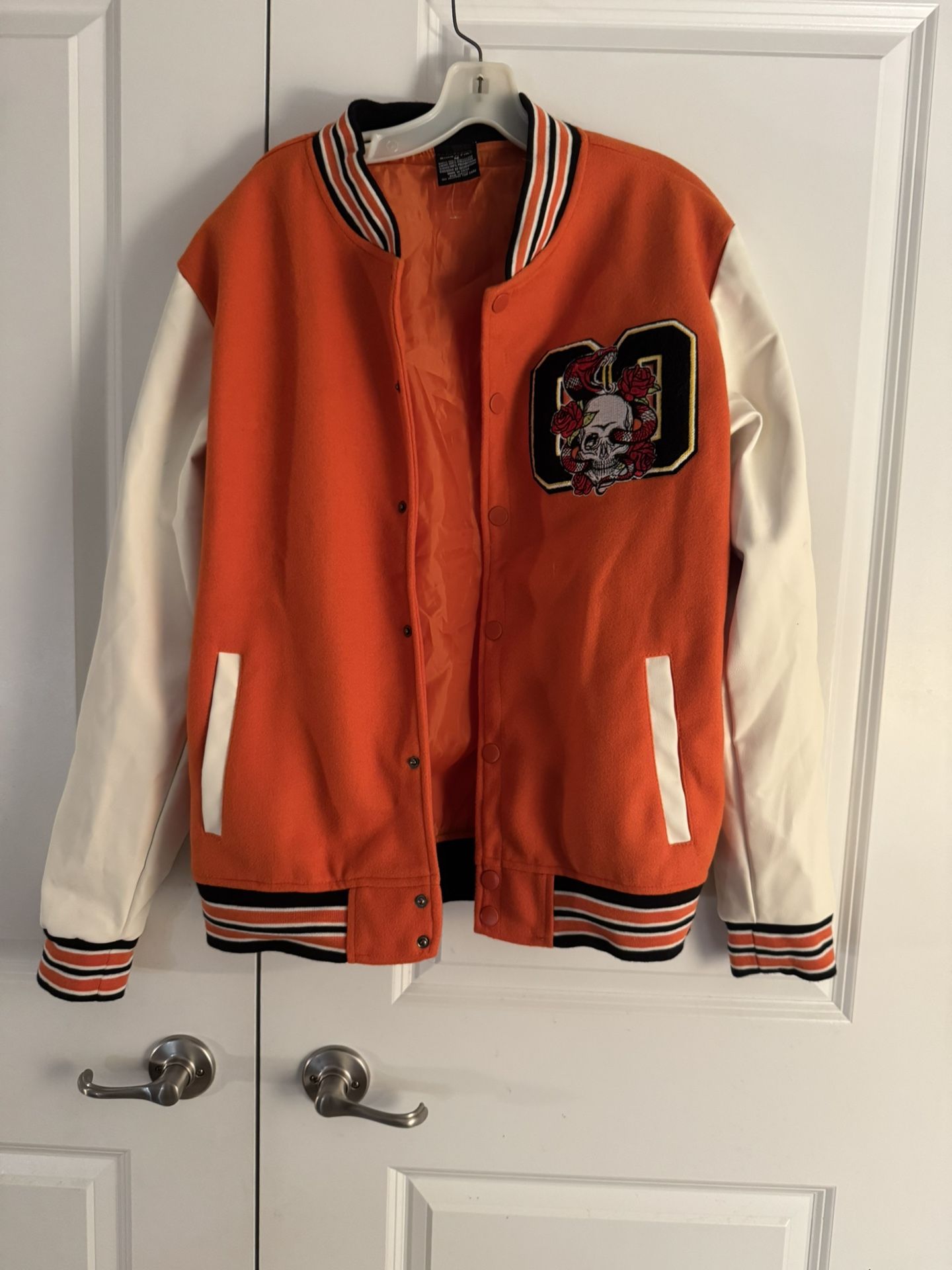 Men’s Ring of Fire Orange and White Varsity Jacket Size Med
