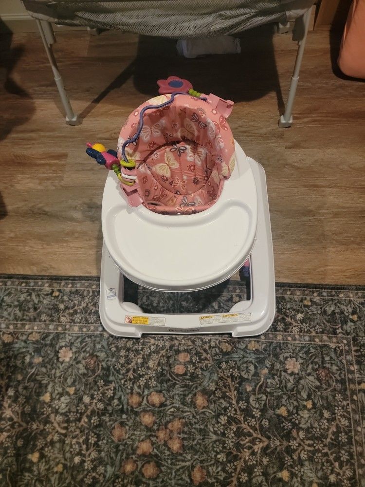 Hardly used not broken in anyway has all pieces BEST OFFER first come first serve Brand baby trend Item Dimensions L x W x H 25.39"L x 23.82"W x 16.34"H Item Weight 8.1 Pounds Maximum Height 32 Inches Trend Walker - Emily Removable toy bar with toys Large surround tray for food or toys Three-position height adjustable High back padded seat Folds flat for easy transport or storage Extra wide base for superior stability Multi-directional front wheels