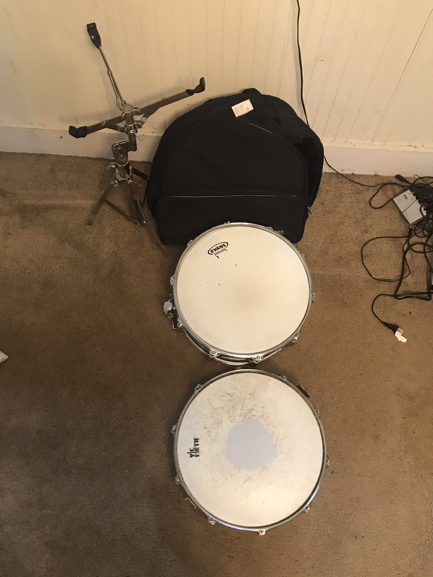 $200 for everything. Rogers Snare - excellent condition, nice deep tone. Bought for $250 a year ago and hardly used because I’m going for a different sound. Vic Firth Snare - has rust on it and some wear but still plays great especially with dampening on snare. Snare stand - well worn but again works fine Pro tec snare bag - great condition