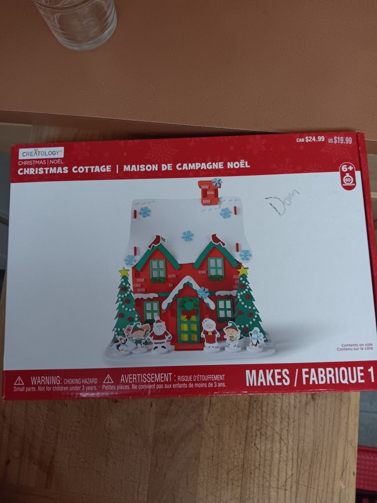 Christmas cottage to make takes approx 60 min. Ages 6+. 2 activity boards picts shows front & back ages 5+, Ornament craft kit ages 6+, takes approx 30 min. Makes 12 ornaments
